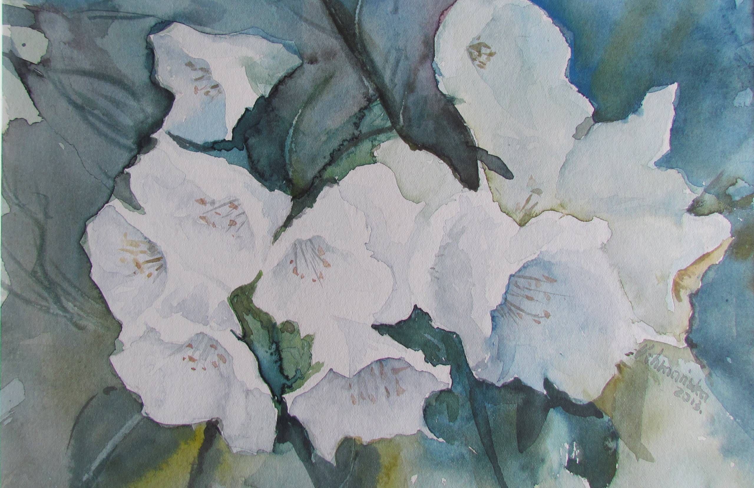 Na obrazie widzimy piękne białe kwiaty, które jakby unoszą się na tle delikatnych odcieni zieleni i błękitu. Kompozycja jest harmonijna, a kontrast między białymi płatkami a ciemniejszymi liśćmi nadaje całości subtelnej elegancji. Akwarelowe techniki użyte przez artystę tworzą efekt miękkich, płynnych przejść między kolorami, co nadaje obrazowi lekkości i subtelności. Całość emanuje spokojem i chwilą wytchnienia, jakby czas na moment zatrzymał się w tej chwili natury. Wystrzał kolorów zieleni w tle kontrastuje z delikatnością białych kwiatów, tworząc atmosferę równowagi i harmonii. To trochę jak patrzenie w głąb leniwej Letniej łąki. Widz, mogąc doświadczać tej wizji, może poczuć się odprężony, zrelaksowany, a nawet zainspirowany magią przyrody. Dzieciak może by powiedział: "Patrz, kwiatki latają!". Taki widok z pewnością pozwala na chwilę zapomnienia o codziennych troskach, zanurzenie się w czystej, nieskażonej przyrodzie. Wzrok napotyka "serenity", co przywołuje wspomnienia sielankowych dni spędzonych na łonie natury. Czuć, że artysta włożył w tę pracę serce i duszę, pozwalając nam na chwilę uciec do krainy spokoju i piękna.