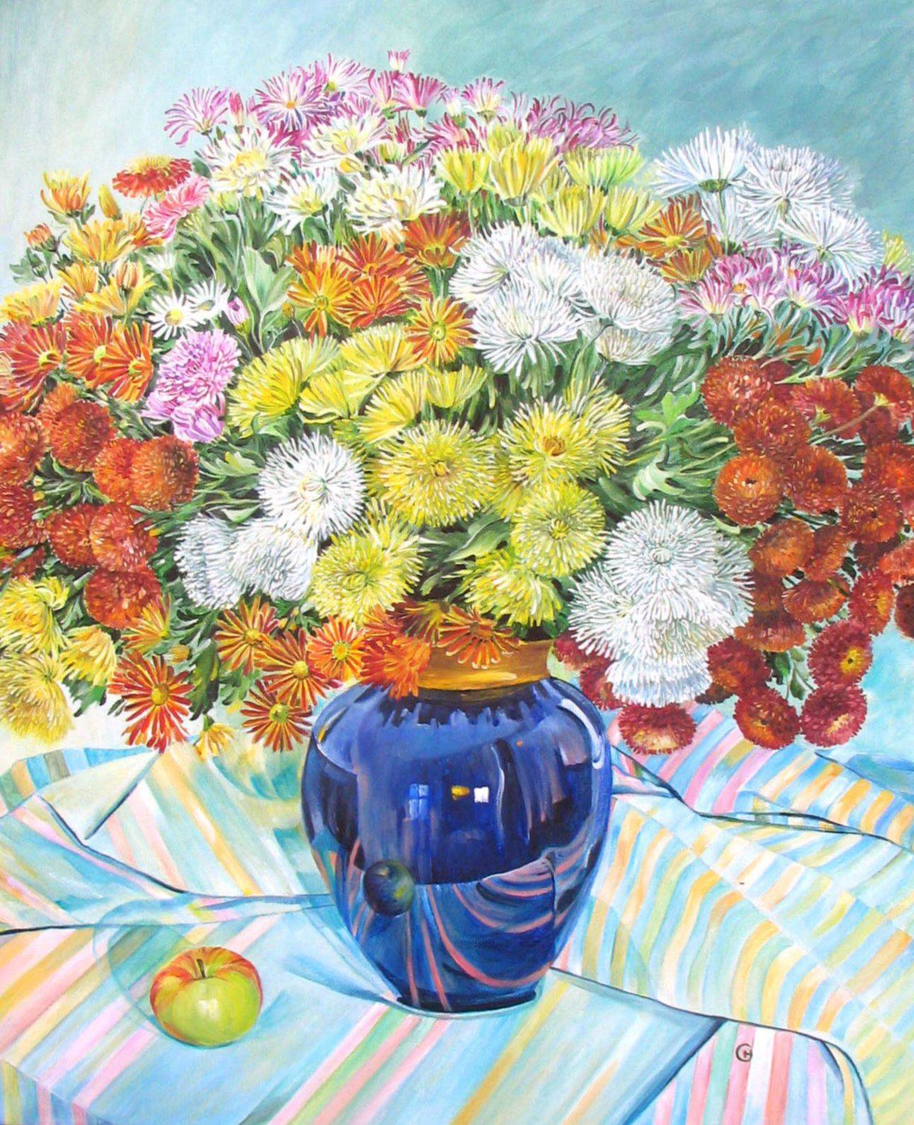 Obraz przedstawia bukiet kwiatów, urokliwie rozkwitający w niebieskim wazonie. Dominują intensywne kolory: żółcie, czerwienie, biele i odcienie różu, które zdają się tańczyć na tle pastelowych, prążkowanych materiałów. Jest też jabłko, zielone jak wiosna. Kompozycja to jak symfonia kolorów, zorganizowana w manierze klasycznego martwego życia. A jakby natura postanowiła zatrzymać czas. Artysta użył bogatej palety barw i techniki pozwalającej na uchwycenie delikatności faktury kwiatów. Nastrój płótna jest spokojny, wręcz idylliczny, przypominający ciepło letniego popołudnia. Atmosfera tego obrazu, choć pełna energii, ma w sobie coś uspokajającego. Obraz może przyprawić o uśmiech, o tęsknotę za dzieciństwem i chwilą beztroski. Może to nostalgia? W każdym razie, jest to jedno z tych dzieł, które można nazwać "breathtaking". Patrząc na nie, czuję wspomnienie babcinego ogrodu. "Te kwiaty są jak tęcza!" powiedziało moje sześcioletnie ja. Taki obraz to nie tylko sztuka – to emocje zamknięte w prostych, ale intensywnych formach.