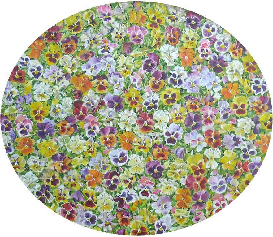 Obraz przedstawia okrągłą kompozycję, pełną intensywnych kolorów i różnorodnych kwiatowych kształtów. Dominują w nim fiolety, żółcie, zielenie i pomarańcze, które razem tworzą bujną mozaikę. Patrząc na tę feerię barw, można poczuć się jak w magicznym ogrodzie. Ai atmosfera jest pełna świeżości i życia, jakbyśmy zaglądnęli do ogrodu po deszczu, gdzie wszystko ożyło i nabrało blasku. Artystycznie mocno inspirowane stylem impresjonizmu, obrazuje lekkość pędzla i dynamiczną mieszankę kolorów. Technika sprawia wrażenie, jakby każdy kwiat był namalowany z uczuciem i precyzją. Jest to praca skłaniająca do uśmiechu, a emocje kojarzą się z wiosną i odnową. Czuję się, jakby te kwiaty mogły zacząć tańczyć zaraz przede mną, a ja byłbym tylko widzem tej feerii. "Wow, tyle kwiatków na raz!" zawołałoby pewnie dziecko. Takie bogactwo szczegółów przykuwa uwagę i daje wrażenie ciepła i optymizmu. Seriously, ten obraz to jest esencja radości. Rozrzutność kolorów przypomina o beztroskich letnich dniach, a uczucie, że żyjemy w pełni – to właśnie to, co czuję.