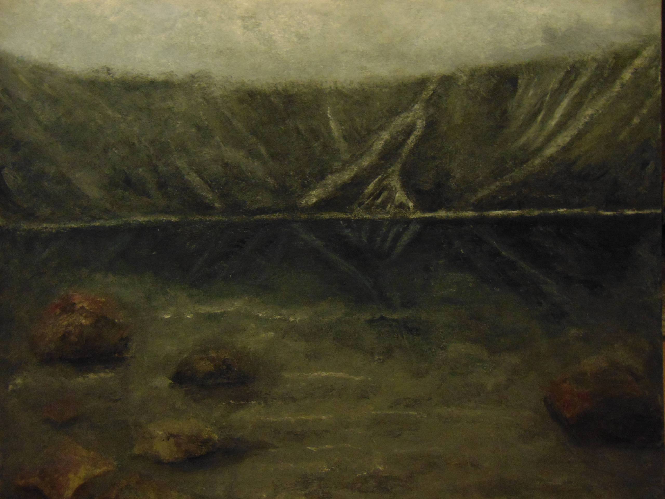 Już sam tytuł mówi o charakterze obrazu,no i jego kolorystyka. Użyte w tym malarstwie kolory szarości w różnych jej odcieniach, określają jesienną porę roku, Głucha cisza i spokój to też jesienne symptomy,kiedy ustają turystyczne wędrówki po Tatrach i tych co je kochają i podziwiają,fotografują i malują. Kompozycja obrazu jet raczej zamknięta. Szczyty i wierzchołki pokryte mgłą.Woda ciemno granatowa. z ogromnymi i mniejszymi głazami wytwarza też wyjątkowy klimat skłaniający do refleksji i przemyśleń. Pragnę by odbiorcy mojej sztuki mieli podobne odczucia.