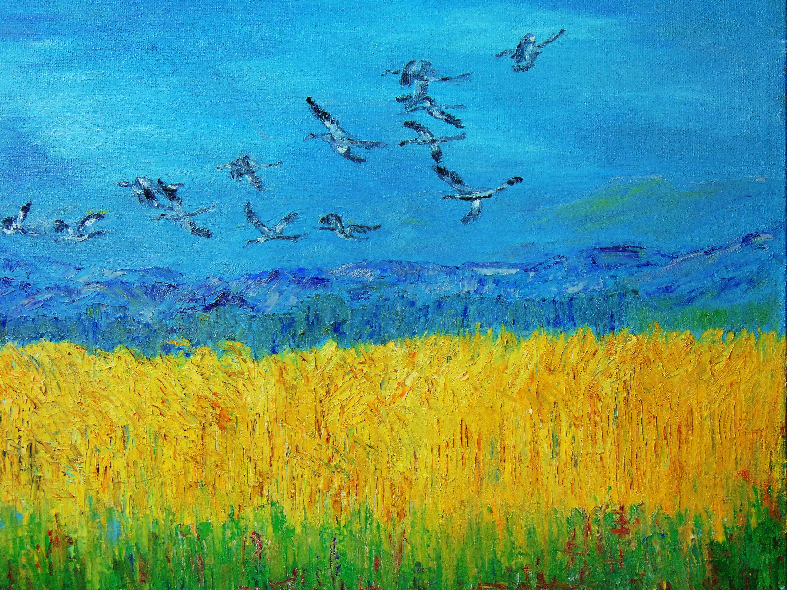 Kompozycja obrazu horyzontalna, otwarta, panoramiczna,wieloplanowa.Nad łanem zboża w pełni lata, około żniw ptaki szykują się do odlotów co zostało zapisane na tym obrazie. Wykonany techniką olejną na płótnie w niezwykle malowniczym plenerze ukazuje typowy polski wiejski krajobraz. W słonecznej aurze nad dojrzałymi łanami zbóż, unoszą się wzwyż i dal, pokaźnych rozmiarów ptaki,które na błękitnym niebie rozpoznawalne są po charakterystycznych dla siebie kluczach przelotowych..
