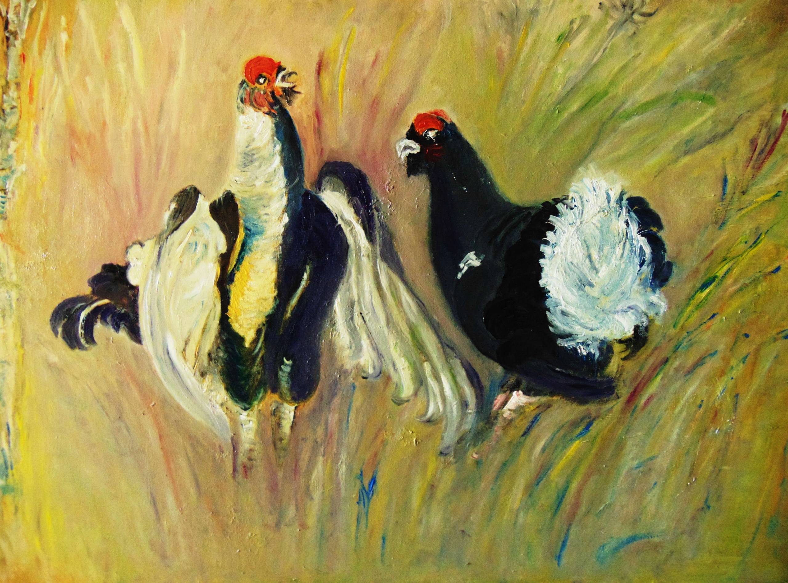 Obraz współczesny,realistyczny, kolorystyka i scena sytuacyjna przyjazna psycgice człowieka, kompozycja zamknięta ptaki raczej rzadko spotykane ,stronią od ludzi ,przebywają pod ścisłą ochroną często z wyglądu mylone z głuszcem.