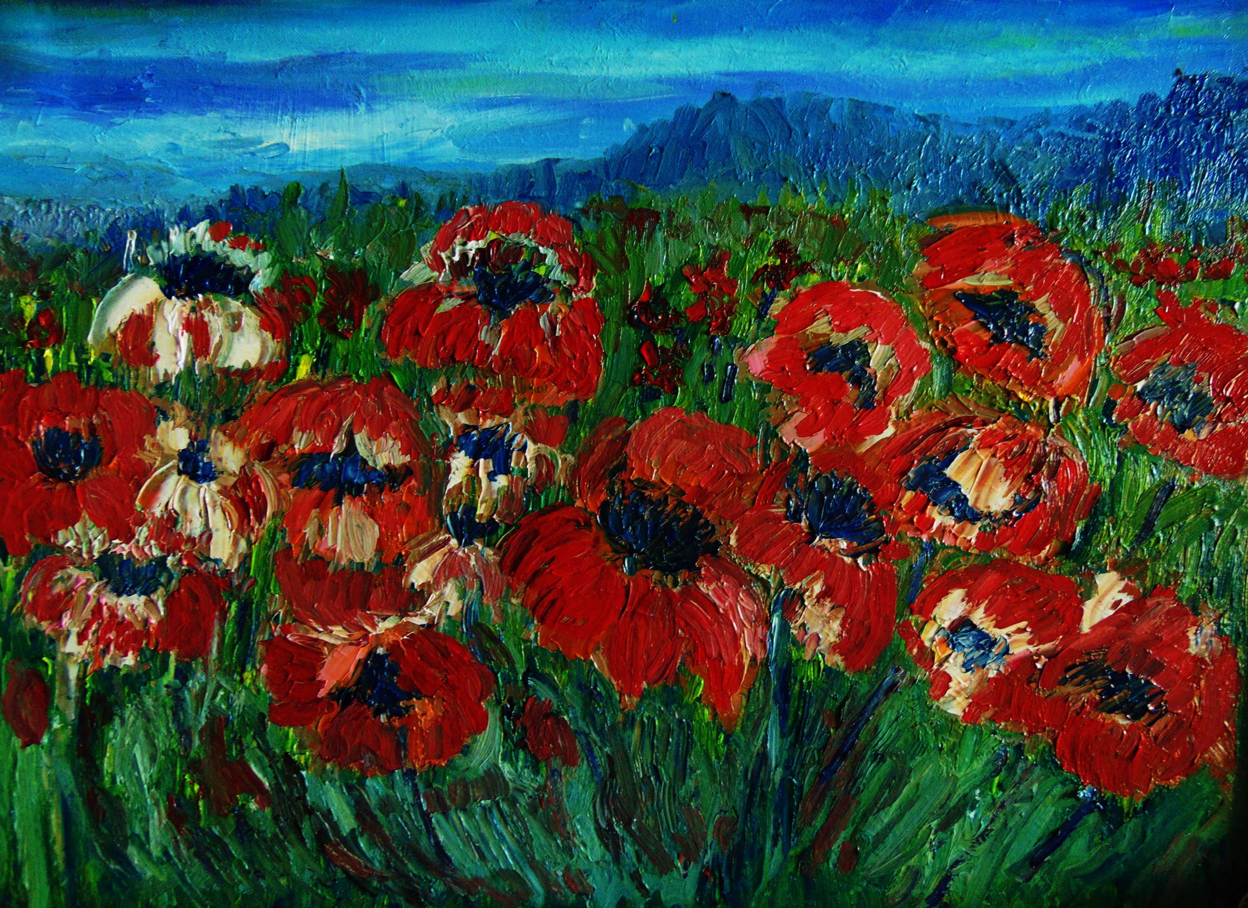 Obraz olejny na płótnie, kolorystyka realistyczna dla pejzażu kwtatów na łące. Sposób przedstawiena tego pejzażu jest jednak abstrakcyjny.Mocna kolorystyka przyrody spontaniczna technika ,dynamika obrazu to wszystko czyni go abstrakcyjnym. Kompozycja zwarta,zamknięta .