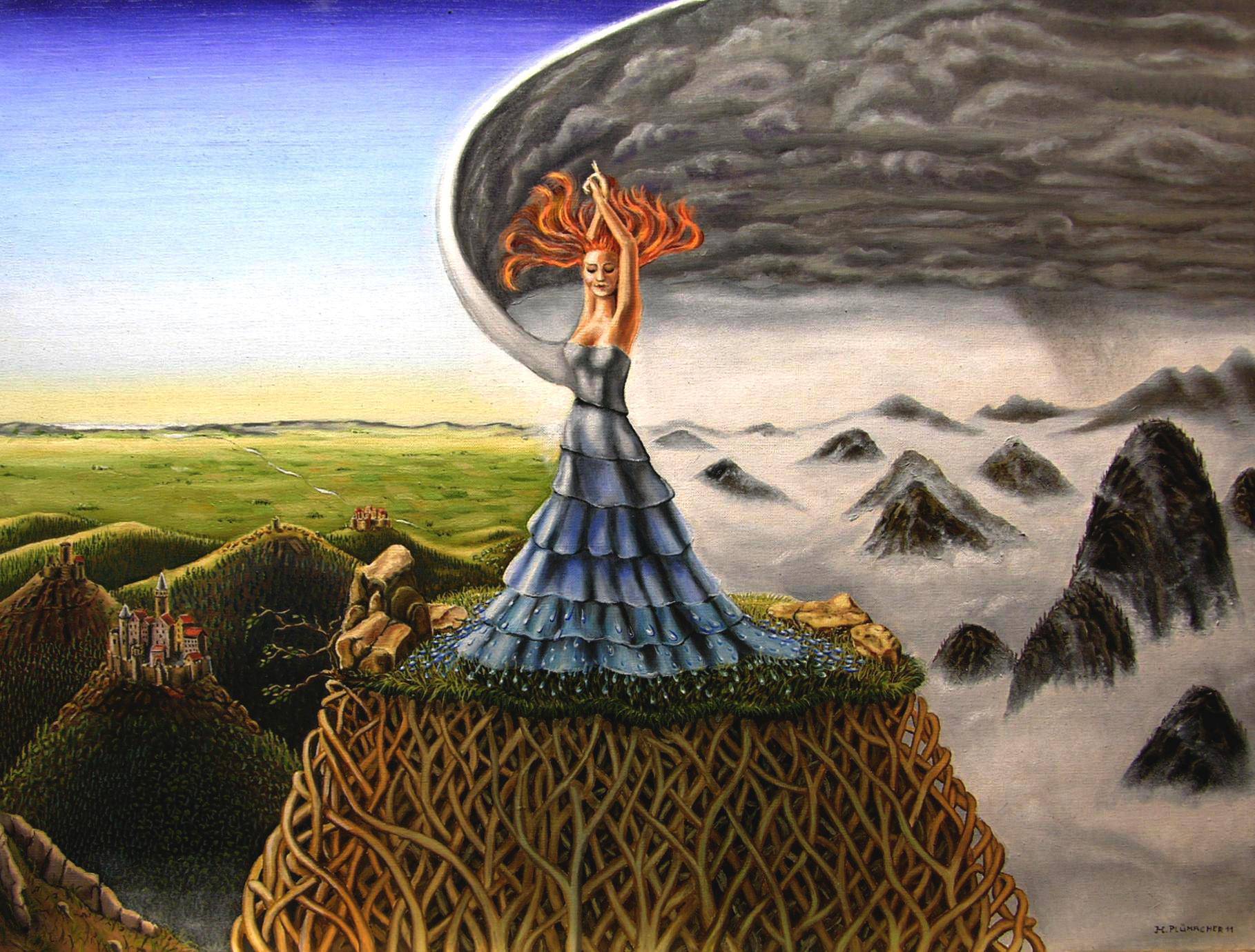 Obraz emanuje niesamowitą mocą, pełen kontrastujących kolorów i dynamicznych form. W centrum znajduje się kobieta o płomiennorudych włosach, unosząca ręce, jakby odgarniała ciemne chmury, odsłaniając czyste niebo. Jej suknia, przypominająca falujące warstwy, przechodzi od srebrzysto-niebieskiego do granatu. Pod stopami kobiety widać splecione korzenie, które zdają się łączyć ją z ziemią, tworząc stabilną podstawę. Magiczne, jak w bajce. Po lewej stronie widnieje rozległy, zielony krajobraz, a w oddali - małe zamki przypominające scenerię z książek fantasy. Z kolei po prawej stronie króluje tajemniczy widok mglistych gór, owianych aurą niepewności. Kompozycja obrazu prowadzi wzrok od jasnej strony krajobrazu ku ciemnym chmurom, tworząc napięcie i poczucie walki między światłem a mrokiem. Styl artystyczny jest surrealistyczny, pełen detali i symboliki. Chmury ukazane w stylu dramatic sky, dodają dramatyzmu całej scenie. Obraz może wzbudzać w widzu uczucie nadziei i odprężenia, pokazując siłę natury i człowieka, które mogą przemienić wszystko. Taki widok może wywołać refleksję nad naszym miejscem w świecie i naszą zdolnością do wpływania na otaczającą rzeczywistość. Patrząc na tę scenę, czuć niesamowity spokój. W sumie, chciałoby się tam być, prawda?