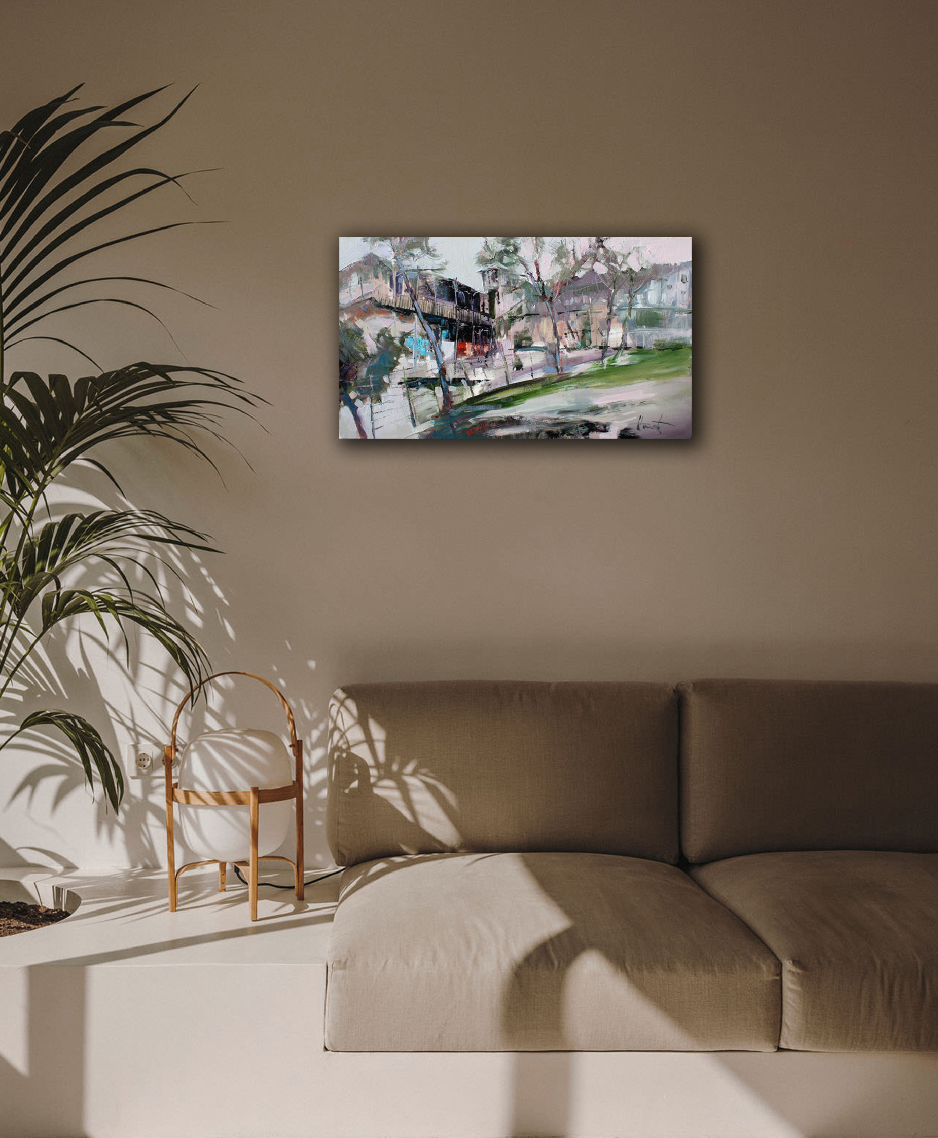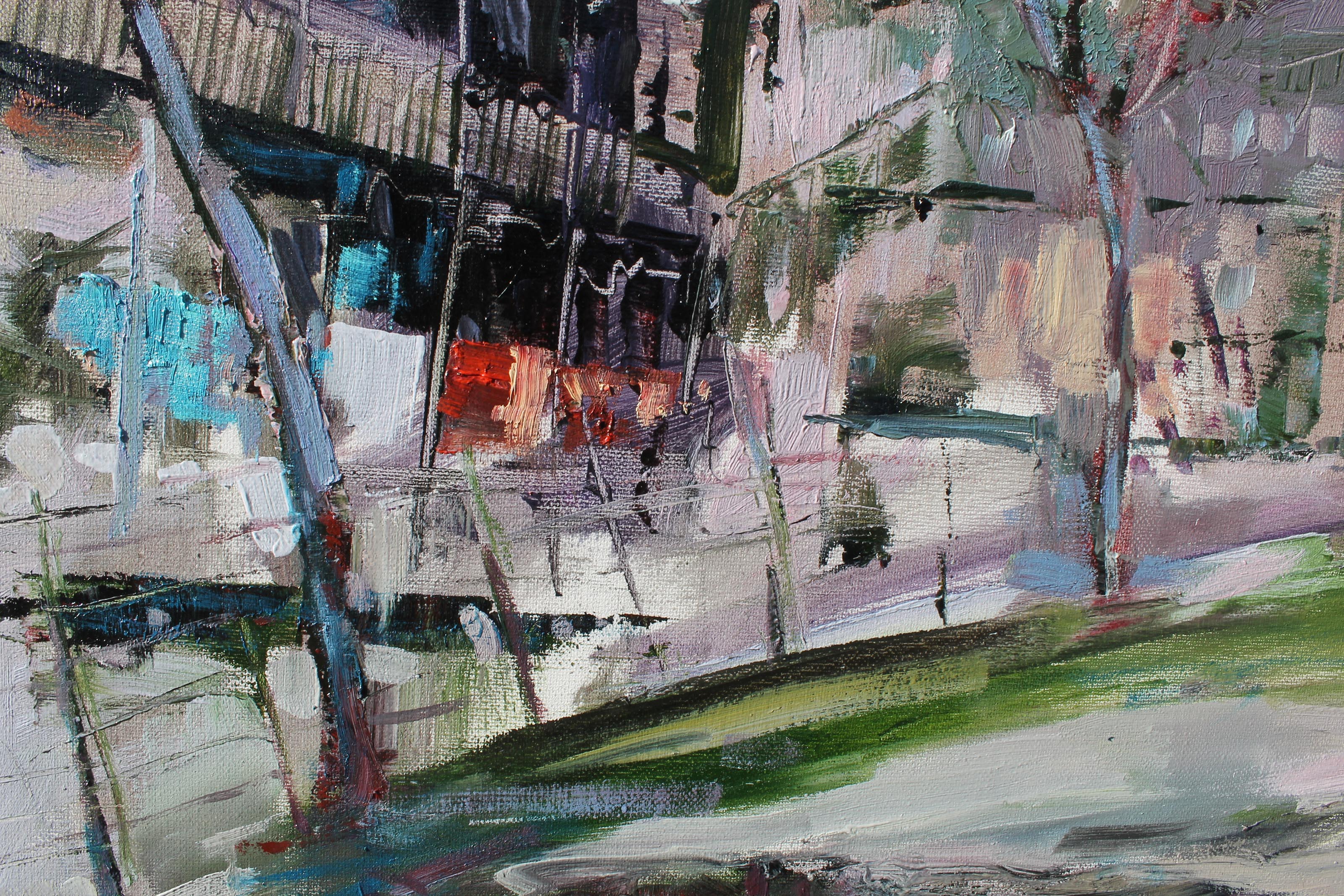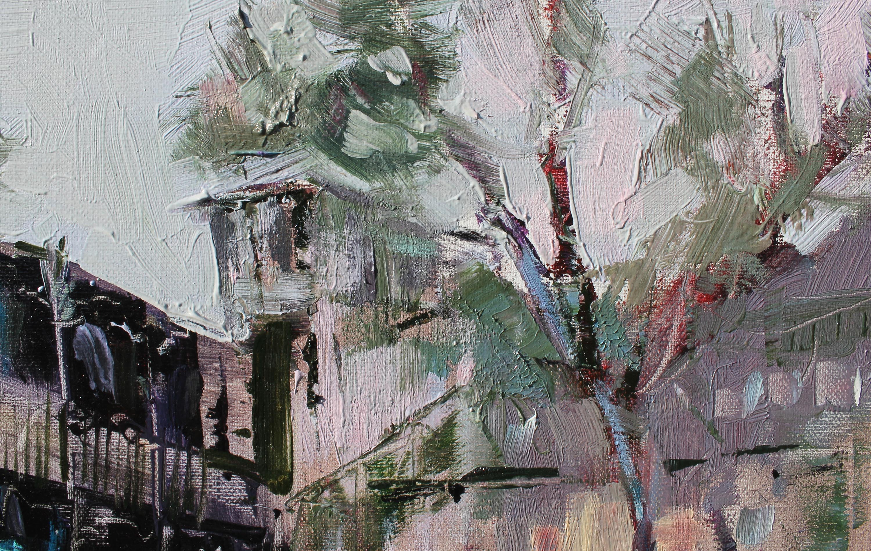Ten pejzaż oddaje atmosferę Starego Tbilisi – miasta, w którym historia, architektura i codzienne życie splatają się w unikalny koloryt. Drzewa, jakby pochylone przez czas, otaczają uliczkę, a charakterystyczne dla Tbilisi balkony, ozdobione rzeźbionymi drewnianymi balustradami, zapraszają do zajrzenia do wnętrza domów, kryjących historie wielu pokoleń. Obraz jest pełen wrażeń z podróży i odkryć – można niemal usłyszeć echo kroków na brukowanych ulicach, poczuć zapach porannej kawy, a promienie słońca na ścianach przypominają o niespiesznym rytmie życia tego niezwykłego miasta.