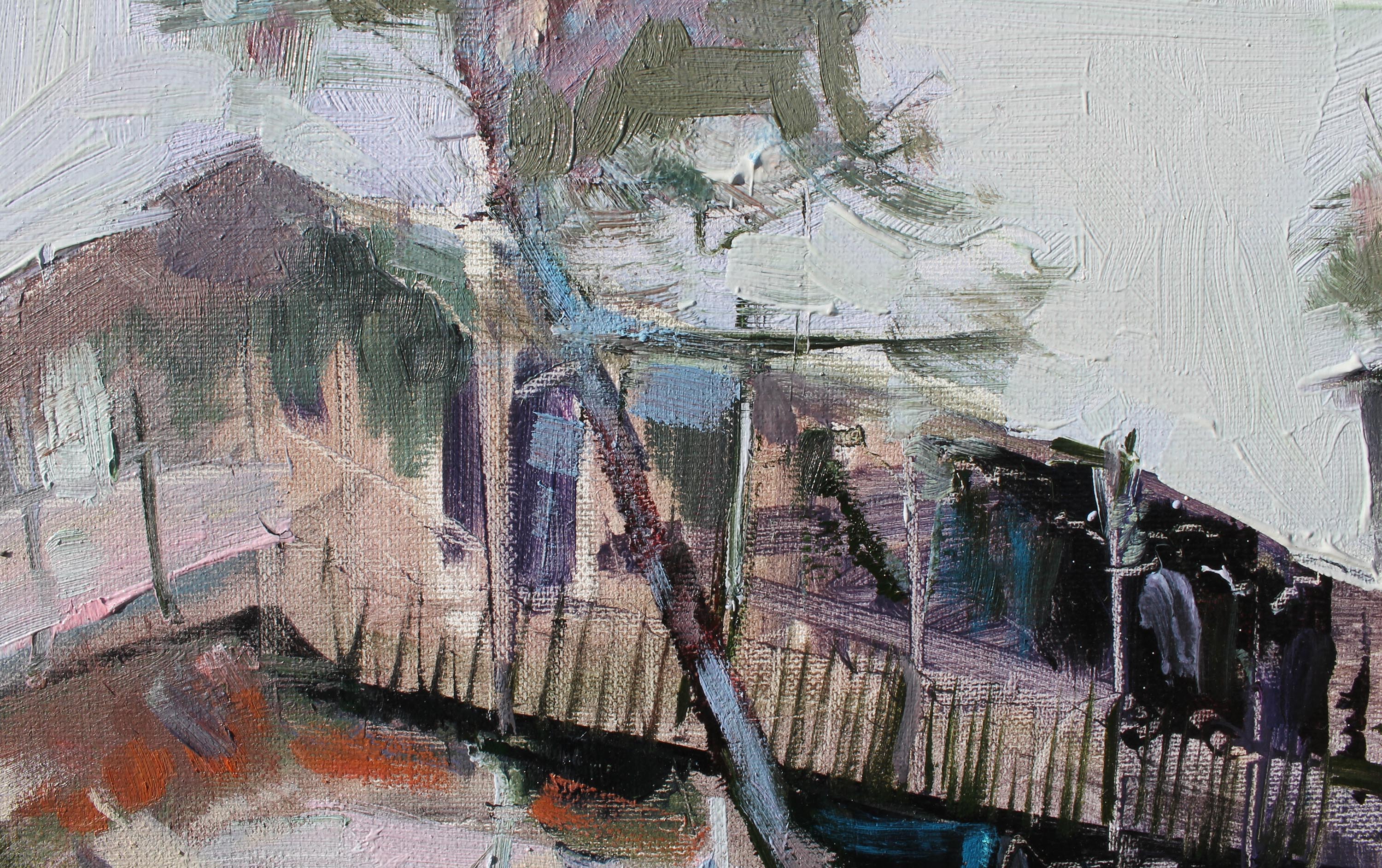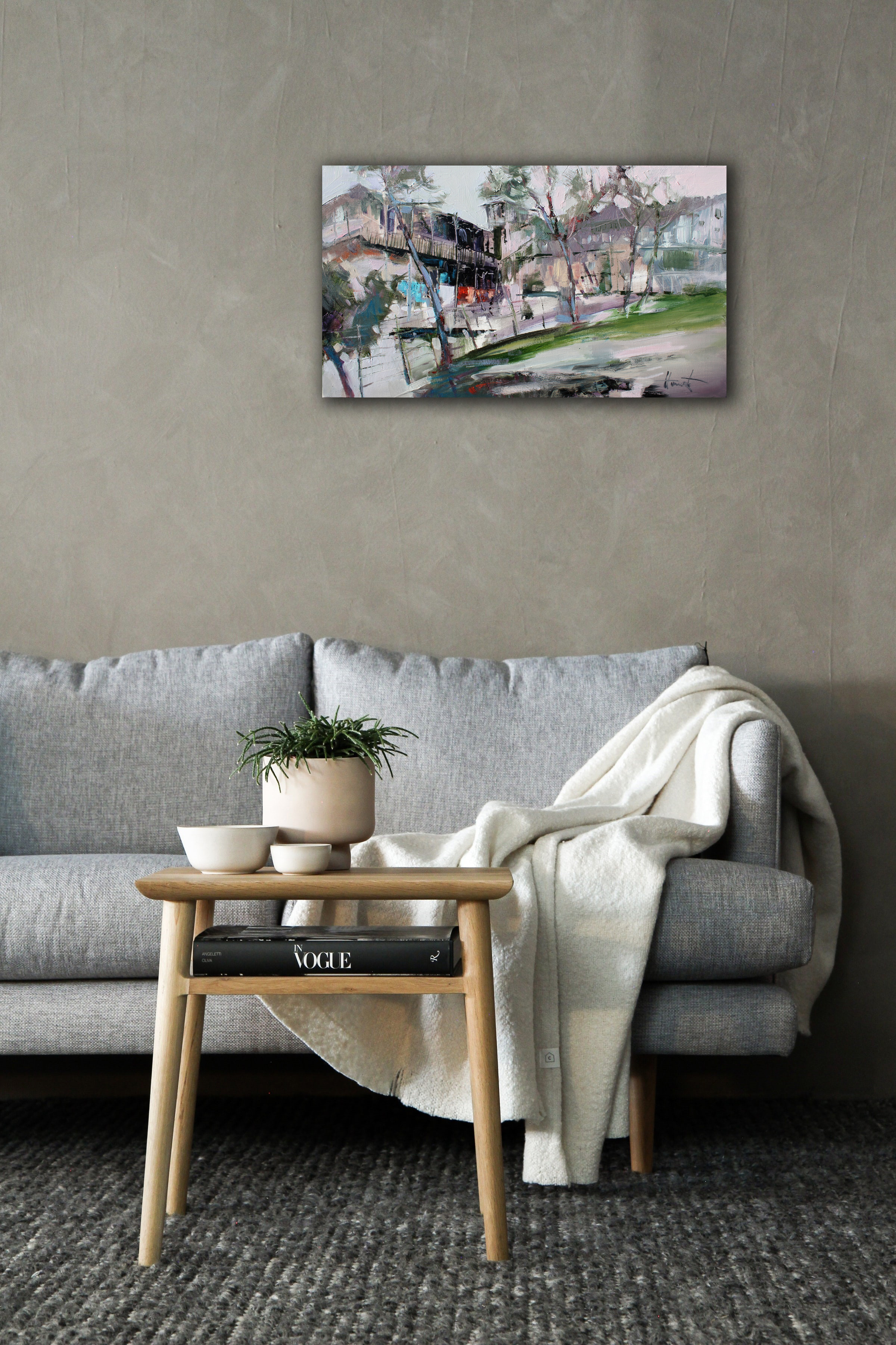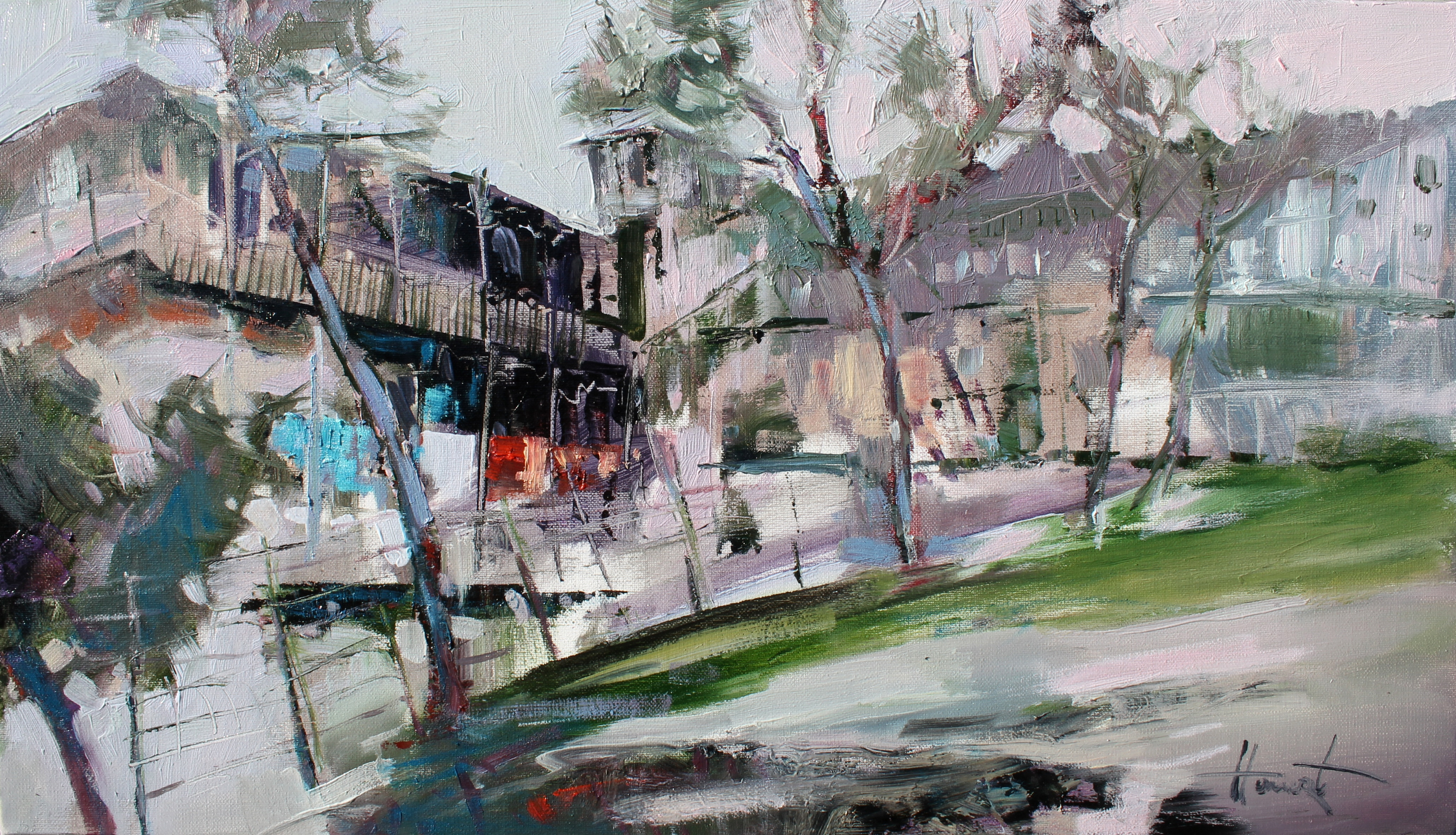 Ten pejzaż oddaje atmosferę Starego Tbilisi – miasta, w którym historia, architektura i codzienne życie splatają się w unikalny koloryt. Drzewa, jakby pochylone przez czas, otaczają uliczkę, a charakterystyczne dla Tbilisi balkony, ozdobione rzeźbionymi drewnianymi balustradami, zapraszają do zajrzenia do wnętrza domów, kryjących historie wielu pokoleń. Obraz jest pełen wrażeń z podróży i odkryć – można niemal usłyszeć echo kroków na brukowanych ulicach, poczuć zapach porannej kawy, a promienie słońca na ścianach przypominają o niespiesznym rytmie życia tego niezwykłego miasta.