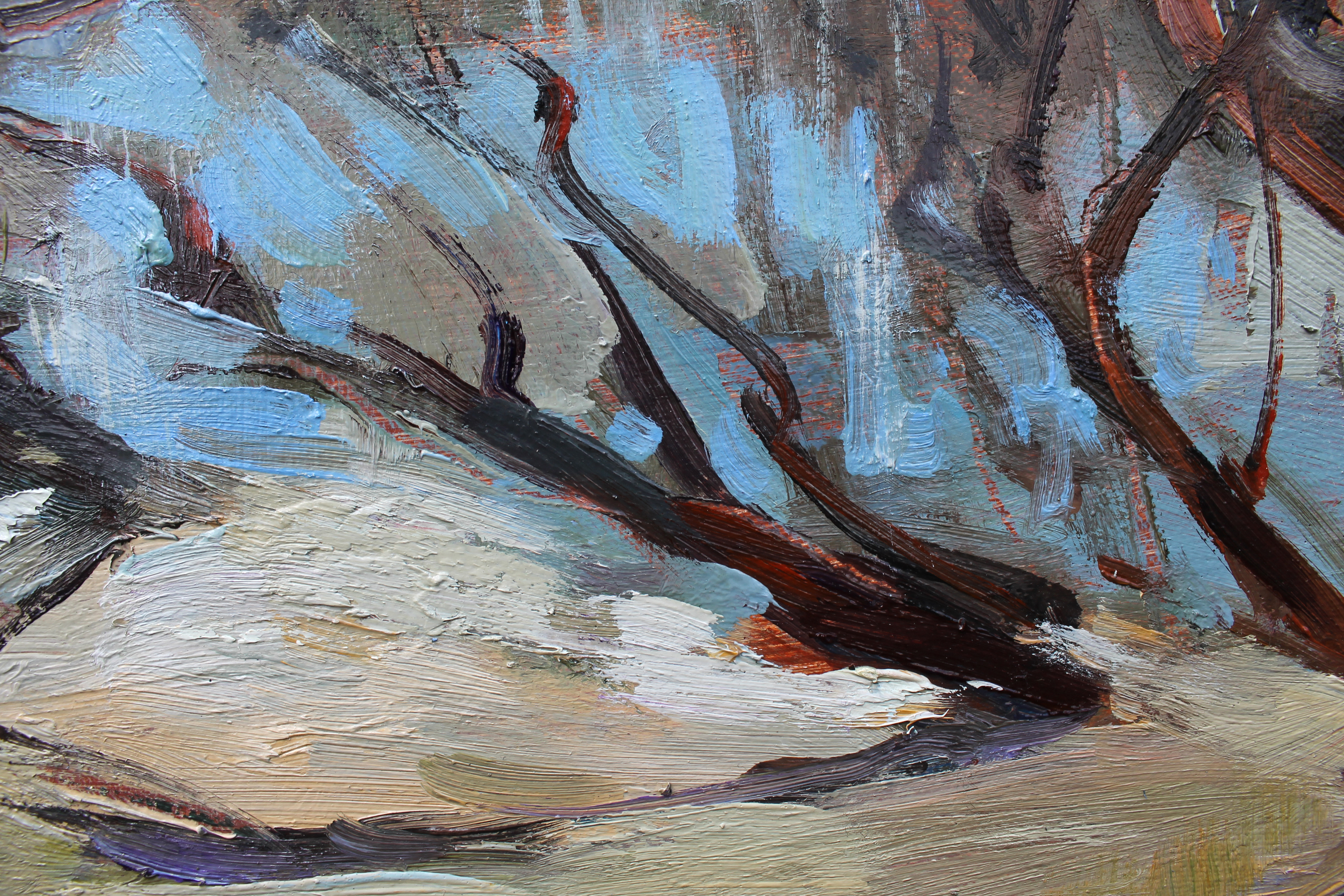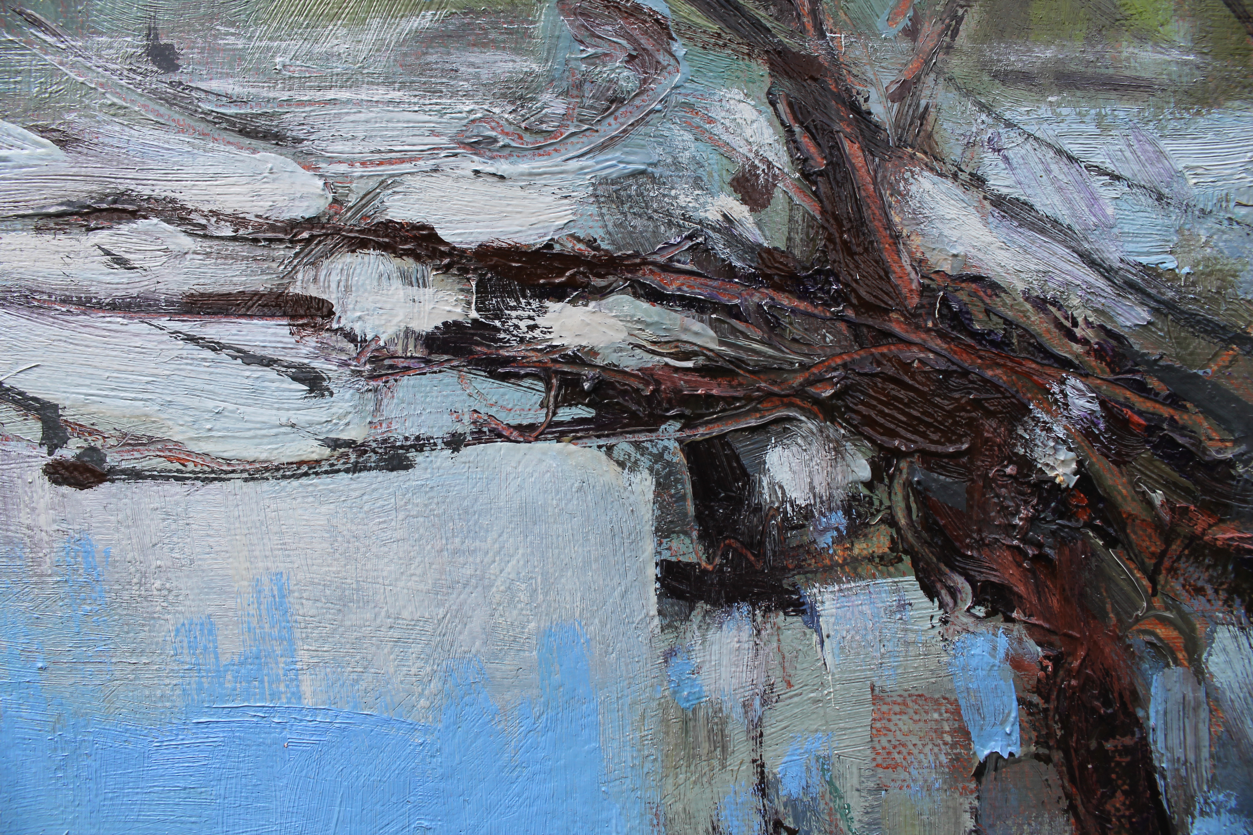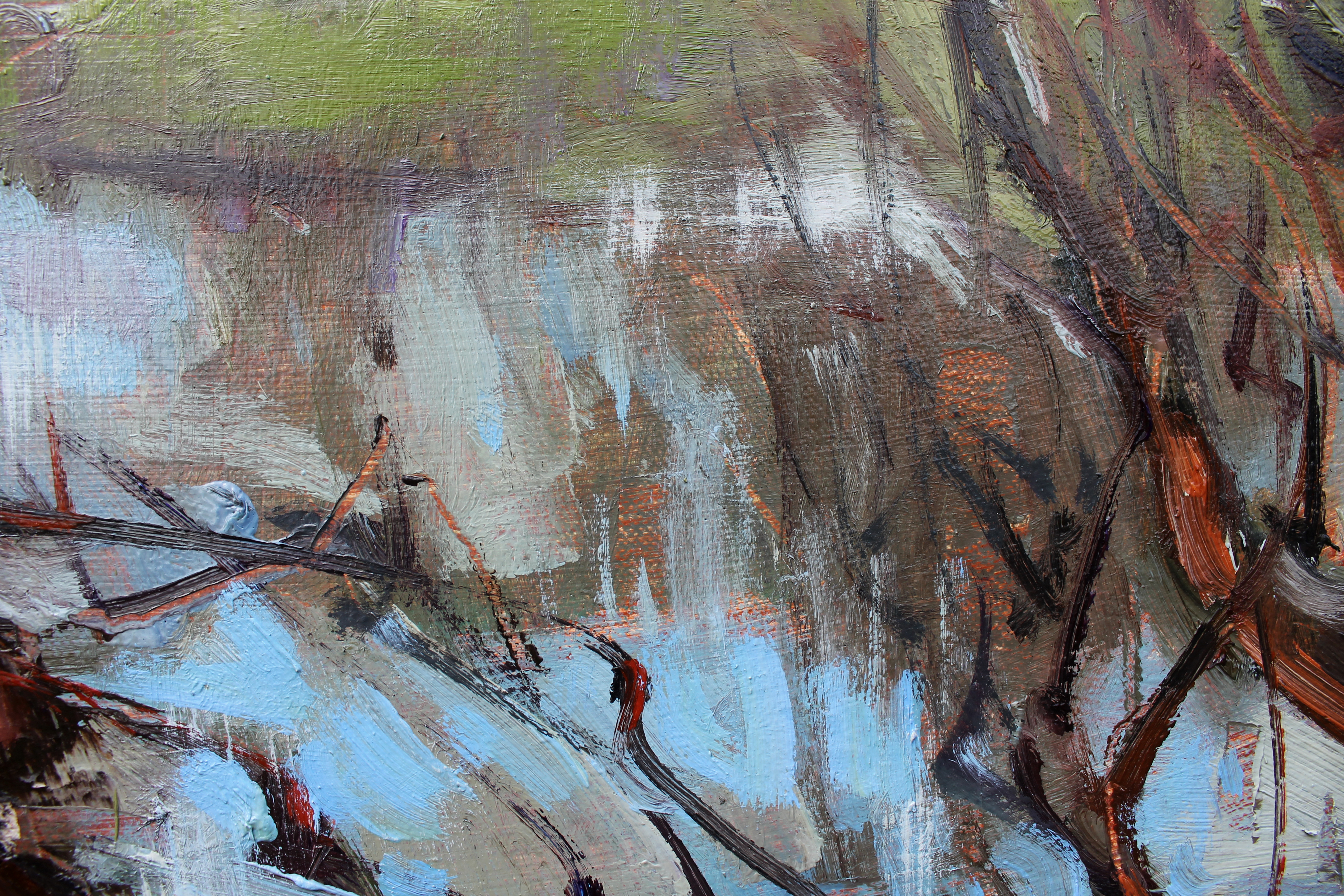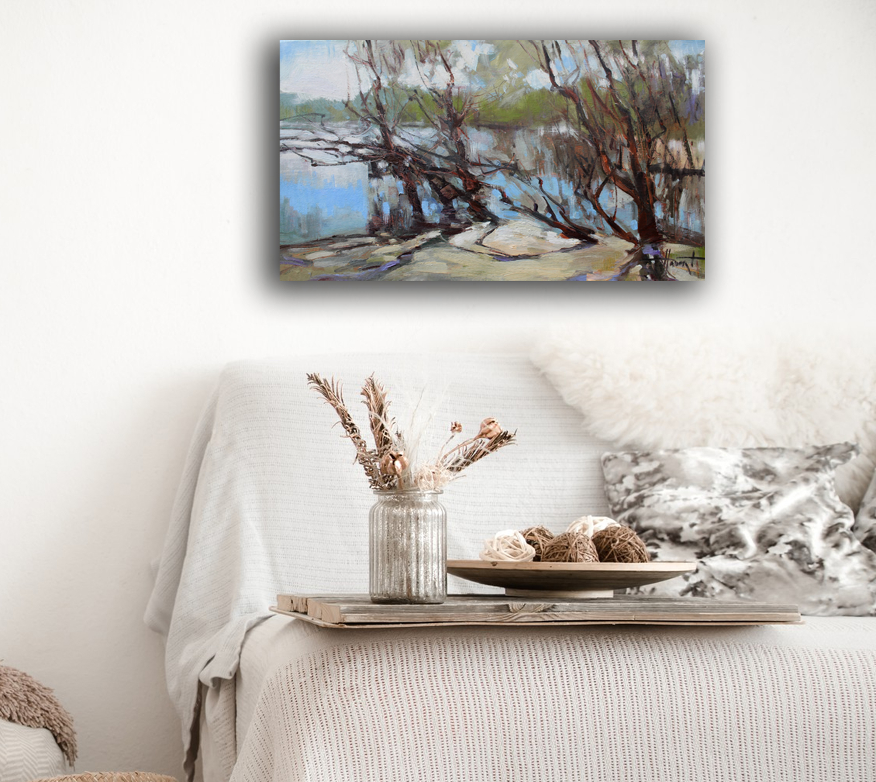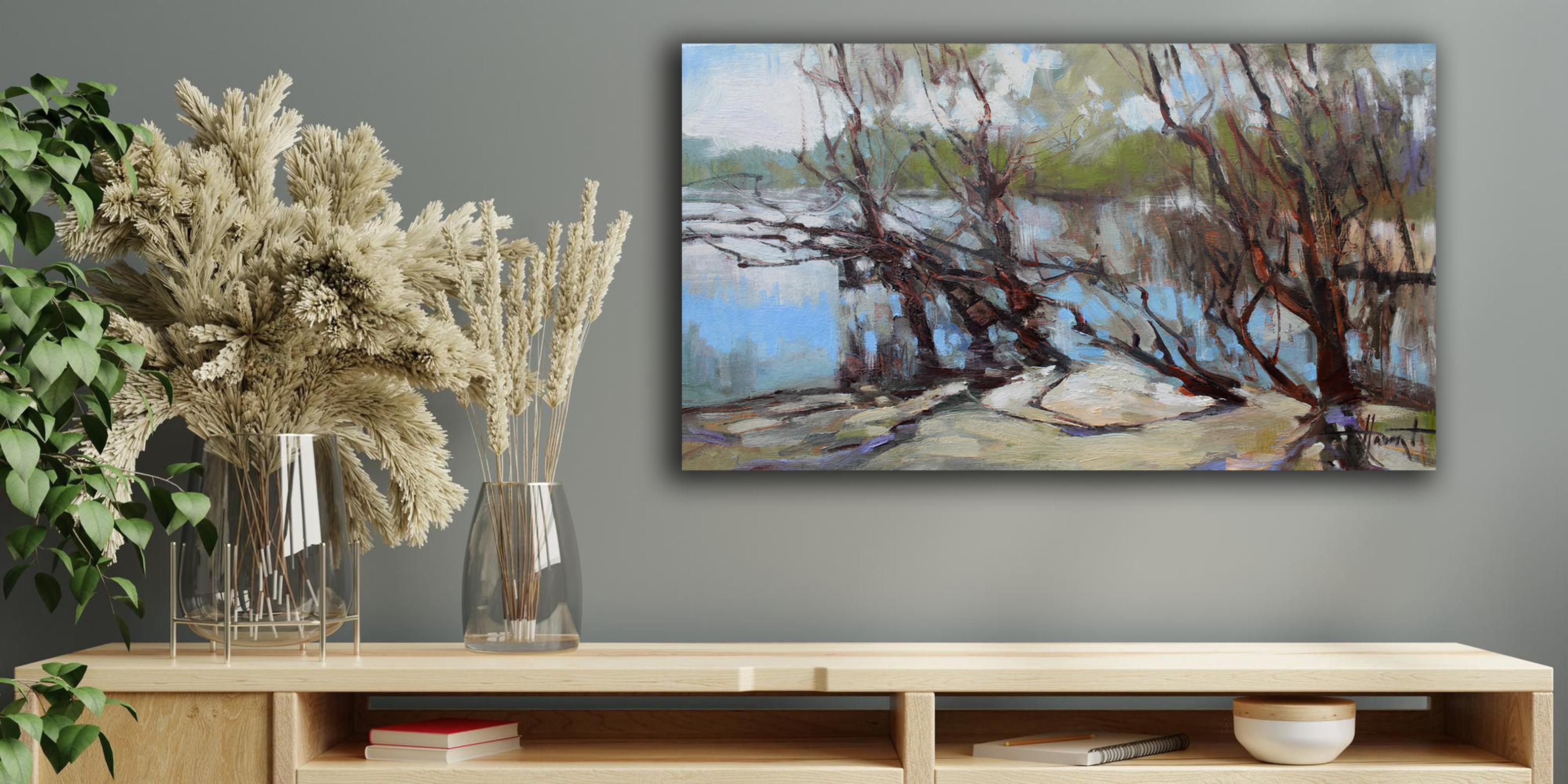 Obraz przedstawia urokliwą scenę natury, w której dominują lekko zamglone odcienie zieleni, błękitu i brązu. Krzewy wybijają się spośród refleksji wody, tworząc dynamiczne linie, które przyciągają wzrok widza. Kompozycja wydaje się chaotyczna, ale jednak pełna harmonii, jakby natura sama zdecydowała, gdzie co ma być. Atmosfera dzieła jest spokojna, ale i nieco melancholijna. Ta zieleń! Piękna jak z bajki. Artysta używa impastu, co daje teksturze obrazu niemal dotykalne wrażenie. Emocje, jakie budzi ten obraz, mogą sięgać od nostalgii po spokojne zamyślenie. Patrząc, można poczuć jak „crisp” powietrze otula skórę. Technika i styl sugerują pewną frywolność i swobodę, którą można czasem spotkać w impresjonizmie. Trudno się nie zatrzymać dłużej na tym obrazie, by dostrzec, jak wiele detali skrywa się pod pierwszym wrażeniem. Gdyby mój kot tu był, pewnie położyłby się na brzegu i zaczął mruczeć z zadowolenia.