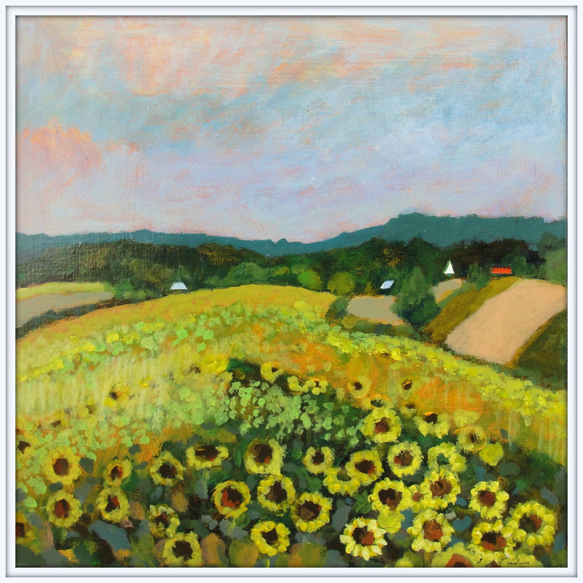 Obraz przedstawia idylliczny krajobraz wiejski pełen słońca i spokoju. Na pierwszym planie widzimy ogród pełen słoneczników, które dumnie sięgają ku niebu. Ich jasne żółcie kontrastują z ciemniejszymi zieleniami liści. Dalej widzimy falujące pola, które zdają się nie mieć końca. W tle ujawnia się linia horyzontu z łagodnymi wzgórzami, a niebo jest pomalowane pastelowymi odcieniami różu i błękitu, sugerując późne popołudnie. Artysta użył techniki impastu, co nadaje tekstury i głębi kompozycji. Taki malarski styl dodaje bliskości i intymności, jakby można było dotknąć płatków kwiatów. Obraz emanuje ciszą i ciepłem letniego dnia. Może przypominać letnie wakacje na wsi, budzić uczucie spokoju i tęsknoty za naturą. Wyobraź sobie, że biegasz tam boso po polach. Wow, ale super! Ta kompozycja jest jak mała podróż do sielskiego świata, pełnego prostych, choć magicznych chwil. I tak naprawdę, kto by nie chciał czasem uciec w tak urokliwe miejsce? Po prostu pure bliss.