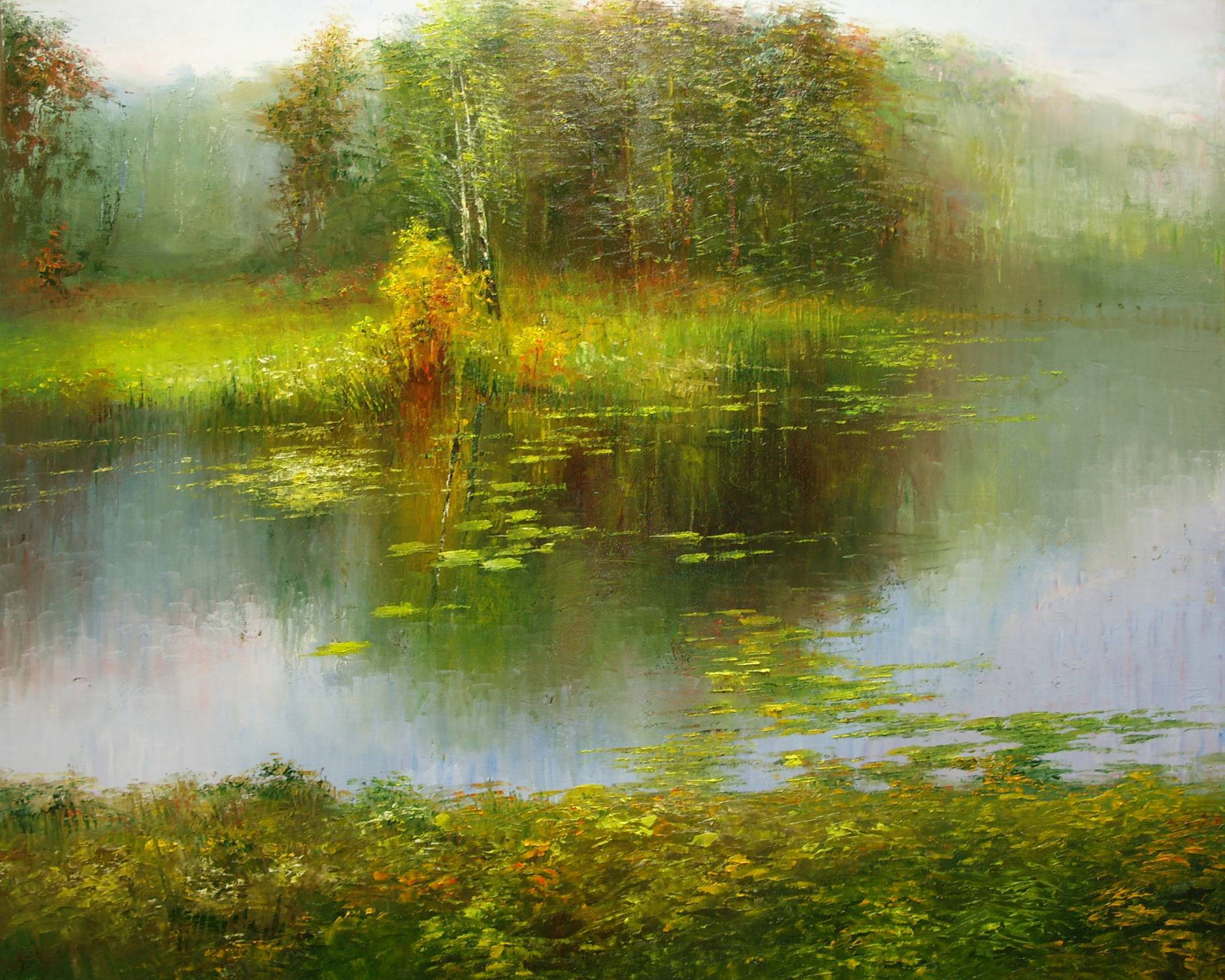 Obraz przedstawia spokojną scenę nad jeziorem, gdzie zieleń jest krótko mówiąc, wprost magiczna. Woda delikatnie odbija barwy otoczenia, tworząc naturalną symetrię. Szczegóły kory drzew, rozmyte, a jednocześnie wyraźne, jakby malowane były pociągnięciami pędzla leniącego się w letnim słońcu. Kompozycja jest harmonijna, przyciąga wzrok, choć nie przytłacza. Kultura i atmosfera, która emanuje z tego dzieła, to mieszanka spokoju z odrobiną tajemnicy. Czy nie czujesz czasem jakby natura szeptała ci coś do ucha? Artysta wykorzystuje tu technikę impresjonistyczną, puszcza wodze wyobraźni. Kolory się przenikają, jak w jakimś magicznym miksie marzeń – green, ochra, niebieski. Styl ma w sobie luz, trochę jak wieczorna sjesta po dniu pełnym przygód. Gdy patrzysz na ten obraz, możesz poczuć błogi spokój, jakby czas się zatrzymał. Wszystko wydaje się takie proste i piękne, niemal jak w bajce. Może pojawić się myśl - chciałbym być tam, usiąść nad brzegiem, zamknąć oczy. A może nawet zostać tam na zawsze. To trochę jak podróż w czasie, do krainy, gdzie stres nie istnieje. "Hej, mamo, tam są kaczki!" mogłoby rzec dziecko, pokazując palcem na staw. I w tej prostocie jest coś ujmującego. Ten obraz to jak list miłosny do natury, bez niepotrzebnych słów, za to pełen emocji i niepokoju. Możesz po prostu wziąć głęboki oddech i poczuć, jak twoja dusza się uśmiecha.