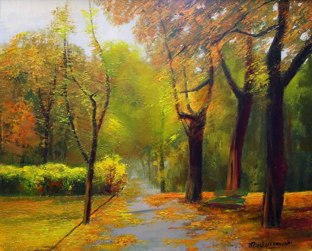 Obraz ten to magiczna podróż do jesiennego parku, pełnego ciepłych, złocistych barw. Drzewa rozciągają swoje gałęzie jak ramiona, zapraszając do spaceru po dywanie z liści. Kolory, takie jak jaskrawe żółcie, głębokie pomarańcze i ciepłe brązy, tworzą harmonijną paletę, która otula zmysły niczym przytulny koc. Jasne plamy światła rozświetlają alejkę, nadając całej kompozycji dynamicznego, niemal bajkowego charakteru. Atmosfera obrazu jest niezmiernie spokojna i nostalgiczna, jakbyśmy trafili do miejsca z naszych childhood dreams. Czuję, jak serce się uspokaja, a umysł wędruje po wspomnieniach. To jak spacer w deszczowy, ale przyjemny dzień, gdy orzeźwiające powietrze wypełnia płuca. Styl artysty przypomina impresjonizm z delikatnymi muśnięciami pędzla. Drobne, szybkie pociągnięcia farby tworzą wrażenie ruchu, tętniącego życia. Sprawiają, że wszystko na obrazie wydaje się drgać, być "alive". Można niemal poczuć zapach wilgotnej ziemi i usłyszeć szelest liści. Ten obraz wywołuje uczucie zadumy i wewnętrznego ciepełka. Może przypominać o przemijającym czasie, ale i o pięknie każdej chwili. Patrząc na niego, wracają wspomnienia rodzinnych spacerów. A ponieważ człowiekowi zawsze gdzieś się spieszy, warto na chwilę się zatrzymać i zanurzyć w tej chwili.
