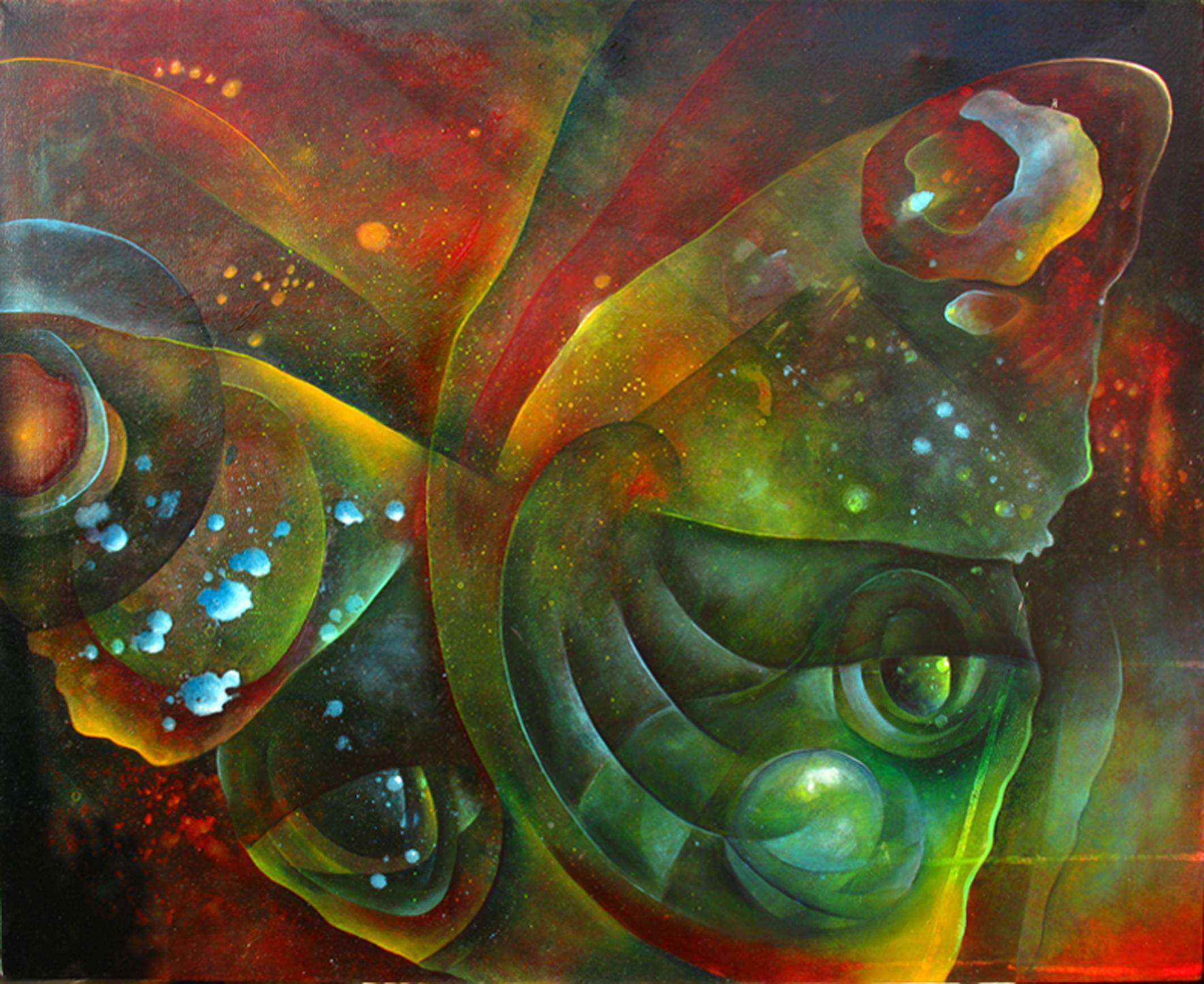 Na obrazie dominują intensywne kolory - ciepłe czerwienie i głębokie zielenie, które mieszają się w dynamiczny sposób. Kształty są abstrakcyjne, przypominają płynne fale czy kosmiczne formy. Stworzone pociągnięciami, które przywodzą na myśl technikę akwareli, ale z intensywnością oleju. Nastrój jest tajemniczy, może nawet trochę nieziemski, jakby artysta chciał przenieść nas w inny wymiar. Styl obrazu jest nieco gwałtowny, co dodaje mu dramatyzmu. Wow, wygląda to jak kosmiczny sen! Te zmienne kształty wywołują we mnie uczucie zagubienia, ale też fascynacji. Zaskakuje, jak różnorodne emocje mogą pojawić się przy patrzeniu na taki obraz. To unbelievable! Obraz może wywoływać myśli o nieskończoności wszechświata, o naturze i naszych osobistych zmaganiach. Pojawiające się jasne punkty dodają nadziei. Ciekawe, co by pomyślało dziecko, patrząc na te kolory - może, że to bajkowa kraina pełna tajemnic. Ten obraz to prawdziwa podróż do wnętrza wyobraźni, która nie pozostawia nikogo obojętnym.