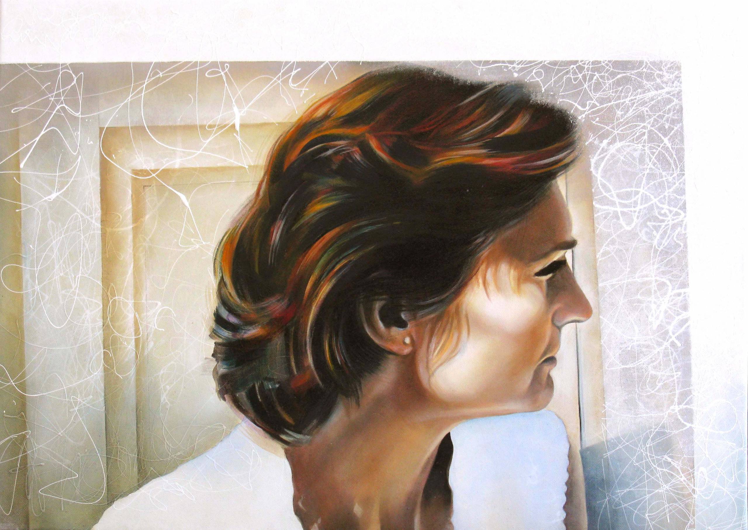 Obraz przedstawia postać kobiety uchwyconą w profilu, której twarz jest pełna skupienia i delikatnej melancholii. Dominują ciepłe odcienie brązów i rudości w jej włosach, które są starannie ułożone. Tło składa się z subtelnych, abstrakcyjnych zarysów w odcieniach bieli i szarości, przypominających swobodnie naszkicowane linie. Kompozycja jest zrównoważona, a artysta z wprawą operuje światłocieniem, co dodaje głębi i trójwymiarowości. Nastrój obrazu jest introspektywny, jakby kobieta rozmyślała nad czymś ważnym. Jest w tym coś znajomego, co sprawia, że widz czuje się częścią jej świata. Technika, której użył artysta, jest realistyczna, z elementami impresjonizmu. Delikatne muśnięcia pędzla tworzą miękkie przejścia między kolorami, co dodaje obrazu subtelności. Patrząc na ten portret, można poczuć spokój, ale i pewien niepokój. Może kobieta czeka na coś lub kogoś? Może coś ją gryzie? Czujesz, że oglądasz moment zatrzymany w czasie, a „wow”, jakie wywołuje, jest niesamowite. Dla dzieciaka, to po prostu pani, która wygląda trochę smutno. Ten obraz jest pełen życia i tajemnic. Coś w nim przyciąga, zmusza do refleksji. Fascynująca gra kolorów i faktur staje się punktem wyjścia do własnych interpretacji.