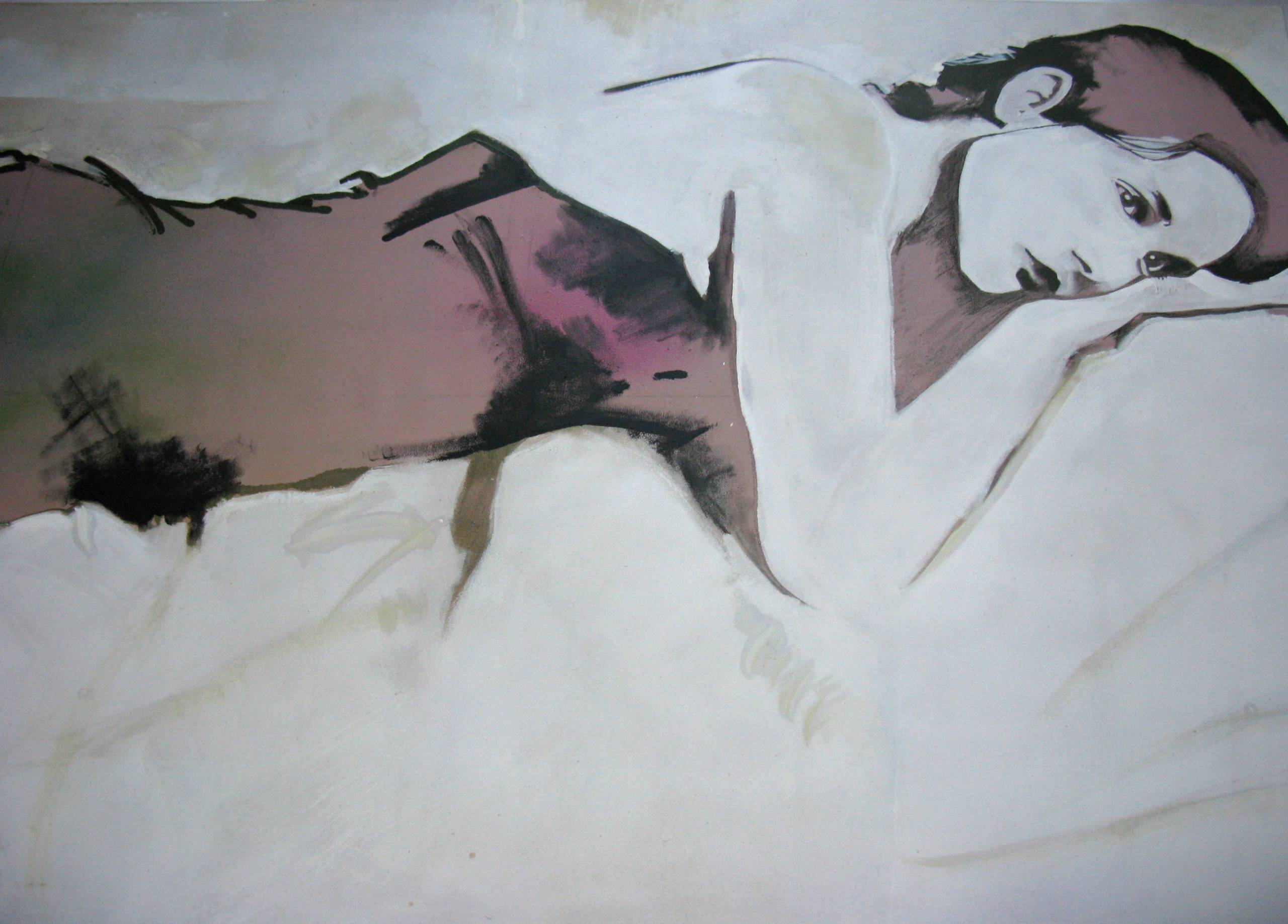Obraz przedstawia postać kobiety leżącej na boku, spoglądającej z delikatnym zawieszeniem myśli. Dominują stonowane barwy, od ciepłych odcieni brązu po subtelne fiolety, które tworzą miękką, nieco nostalgiczna atmosferę. Tło jest jasne i minimalistyczne, co podkreśla centralną postać i dodaje jej głębi. Kompozycja jest spokojna, lecz pełna subtelnych emocji. Artysta posłużył się techniką łączącą miękkie pociągnięcia pędzla z precyzyjnymi konturami, co nadaje obrazowi charakteru nieco onirycznego. Obraz ten zdaje się być fragmentem chwili zamyślenia, momentu zawieszenia między rzeczywistością a marzeniem. Patrząc na niego, można poczuć pewną melancholię, ale i spokój wynikający z odosobnionej refleksji. Technika, jaką zastosował twórca, pozwala widzowi błądzić wśród tych uczuć, subtelnie je analizując. Widać, że artysta potrafi bawić się światłem i cieniem, co czyni to dzieło wyjątkowym. A ona patrzy, jakby zanurzona w swoich myślach, prawda? Taki moment sprawia, że człowiek zaczyna wspominać, może zatęsknić za czymś utraconym. Jest w tym coś "mysterious", nieprawdaż? Patrzenie na to dzieło to jak rozmowa z samym sobą, skręcona w emocjonalnym tańcu refleksji. Jestem pewien, że wielu z nas odnajdzie w tym coś własnego.