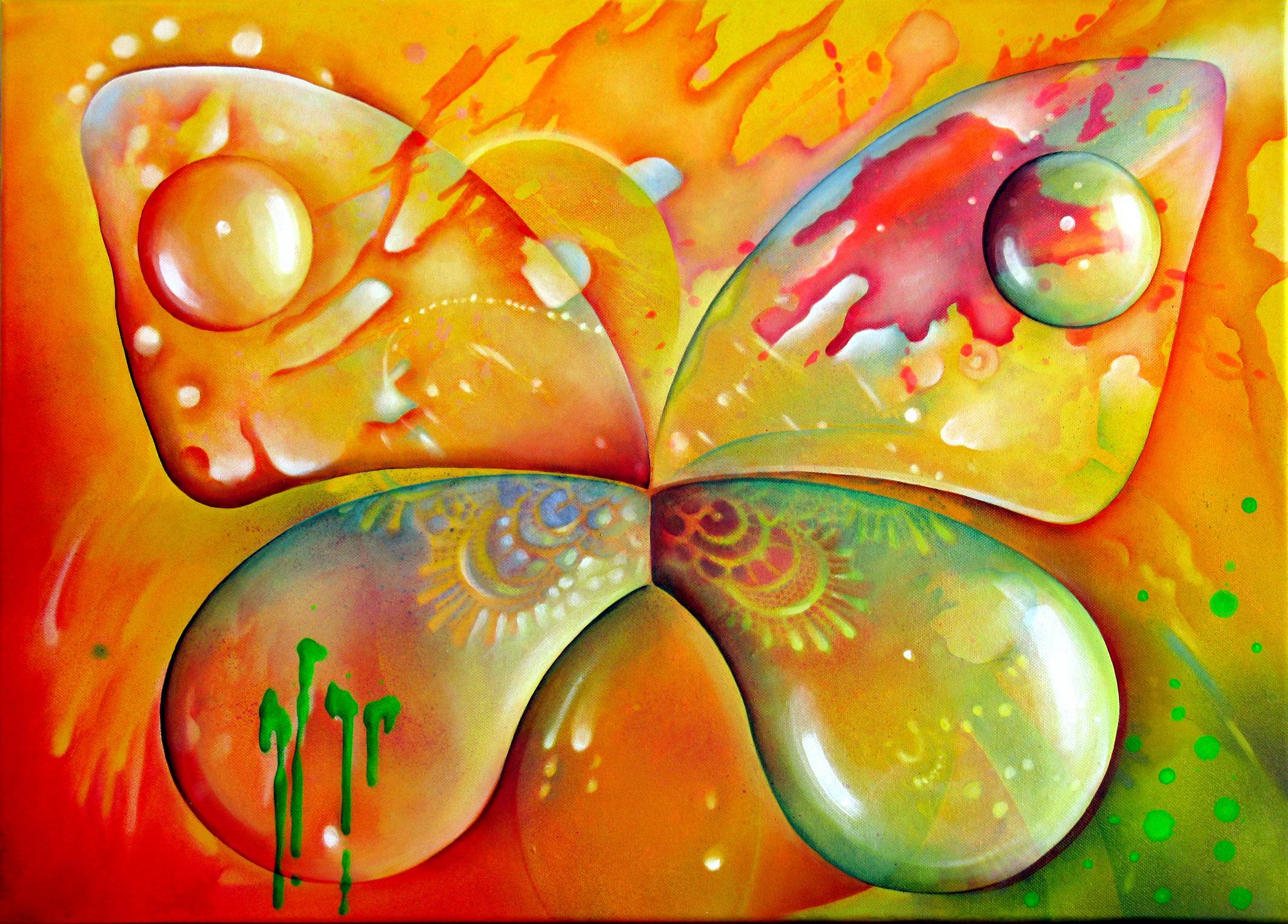 Obraz przyciąga wzrok intensywnymi, żywymi kolorami, które płynnie przechodzą z ciepłych żółci i pomarańczy do chłodniejszych odcieni zieleni i niebieskiego. Kształty przypominają skrzydła motyla, wzbogacone abstrakcyjnymi wzorami i kropkami, które dodają całości ruchu i dynamiki. Kompozycja wydaje się niemalże jak eksplozja barw, gdzie każda kropla koloru znajduje swoje miejsce, tworząc harmonijną całość. Atmosfera dzieła jest lekka i radosna, niemalże euforyczna. Jakby świat na chwilę zatrzymał się, żeby uchwycić magiczny moment pełen życia i energii. Artysta umiejętnie posługuje się technikami aerozolu i akrylu, co daje efekt półprzezroczystości i blasku. Czuć w tym styl graffiti, a może nawet urban art. Patrząc na ten obraz, można się uśmiechnąć, poczuć przypływ pozytywnej energii i radości. "Motylek się zgubił", mogłoby powiedzieć dziecko, z fascynacją śledząc linie i plamy koloru. To także przypomina o pięknie przemijających chwil, które warto celebrować. Zaskakuje mnie, jak jedna grafika może wywołać tyle różnorodnych emocji. Happiness in color, chciałoby się powiedzieć, widząc tę eksplozję kreatywności i życia. W końcu, czasem sztuka mówi więcej niż tysiąc słów, a ten obraz mówi bardzo dużo.