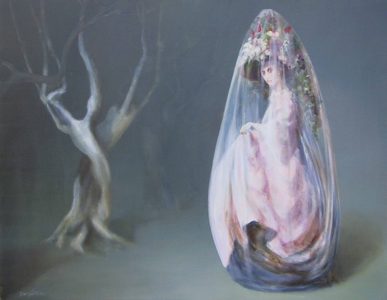 Obraz przedstawia postać zamkniętą w przezroczystym kokonie, w otoczeniu pochmurnego, mglistwego tła. Dominuje tutaj subtelna paleta kolorów – różowe, szare i błękitne odcienie delikatnie przeplatają się ze sobą. Drzewo na lewo wygląda jakby było wyjęte z innego świata, blade i nie do końca materialne. Artysta, korzystając z technik mieszania kolorów i rozmytych kształtów, nadaje dziełu oniryczny, wręcz magiczny charakter. Styl jest dreamlike, niemal jak z bajki, upstrzony miękkimi przejściami tonalnymi. Atmosfera obrazu jest tajemnicza i pozornie spokojna, ale jednocześnie nieco niepokojąca. Można wręcz wyczuć napięcie między delikatnością postaci a ciężarem otoczenia. Patrząc na to dzieło, można poczuć mieszankę melancholii i fascynacji. Kto ukrywa się za zasłoną tej mgły? Czy to iluzja, a może obraz przedstawia coś z naszego wnętrza? Czyż nie przypomina to troszkę baśni, które opowiada nam babcia przed snem? Dziecko mogłoby powiedzieć: „To chyba księżniczka w lodowej komnacie”. Ten obraz skłania do refleksji. Może to czasem mylne wrażenie, ale przecież każdy może widzieć w nim coś innego, coś własnego. To jak podróż przez tajemniczy sen.