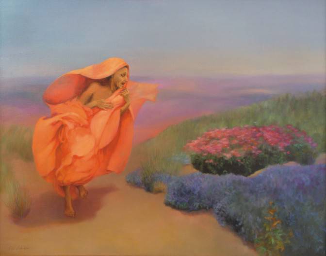 Obraz tchnie magią i tajemniczością. W centrum widzimy postać otuloną w pomarańczową tkaninę, która delikatnie powiewa na wietrze. Barwy są ciepłe, odcienie różu i pomarańczu harmonijnie przeplatają się z zielenią, tworząc bajkowy krajobraz. Tło, rozmyte jak w marzeniu, emanuje spokojem. Kompozycja przyciąga wzrok od postaci po kwiatowe pola, które zdają się być miękkim dywanem. Atmosfera obrazu to mieszanka spokoju i lekkiego niepokoju. Wyczuwalna jest nutka magii, jakbyśmy podglądali chwilę z innego świata. Styl artysty przypomina impresjonizm z delikatnymi pociągnięciami pędzla, które wprowadzają nastrój dream-like. Kolory są rozmyte, a technika malarska subtelna. Emocjonalnie obraz może wywołać uczucie tęsknoty za czymś nieokreślonym. Trochę ciarki przechodzą po plecach, bo nie wiadomo, kim jest ta postać i dokąd zmierza. Może to wygląda jak scena z bajki, gdzie niewiadome jest na wyciągnięcie ręki. A może opowiada historię duszy poszukującej swojego miejsca na ziemi? Pewien smutek miesza się z ciekawością. A ja myślę sobie, że kawałek magii w naszym życiu jest absolutely essential. Jak mówi zdanie 7-letniego dziecka: "Chcę tam pobiegać z motylami". Ta swobodna myśl upraszcza, a zarazem dodaje uroku całemu dziełu. Obraz tworzy przestrzeń do interpretacji i pozwala na własne refleksje, co jest jego wielką siłą.