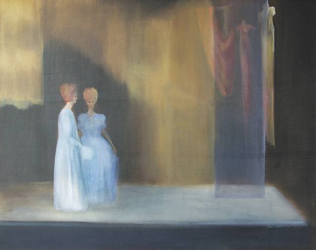 Obraz przedstawia dwóch eterycznych bohaterów, ubranych w jasnoniebieskie suknie, które zdają się delikatnie unosić w powietrzu na scenie zalanej złotym światłem. Tło malowane jest miękkimi pociągnięciami, tworząc mglistą, niemal oniryczną atmosferę. Dominują tu ciepłe odcienie beżu przełamane ciemniejszymi cieniami. Jest w tym coś magicznego. Pisząc to, czuję, jakby czas się zatrzymał. Technika malarska balansuje na granicy realizmu i impresjonistycznego rozmycia, nadając całości aurę tajemniczości. „Patrz, mama! One wyglądają jak wróżki!” - mogłoby powiedzieć dziecko. Obraz poprzez swoją subtelność wprowadza nas w nastrój ciszy i kontemplacji. Pojawia się tu lekka nuta melancholii. To, jak światło wpada na scenę, sprawia, że zastanawiam się, czy to sen czy rzeczywistość - pure magic. Przyglądając się, można wyczuć spokojne napięcie, jakby za chwilę miało wydarzyć się coś niezwykłego. To dzieło skłania do refleksji nad ulotnością chwili i pięknem, które kryje się w codziennych momentach.