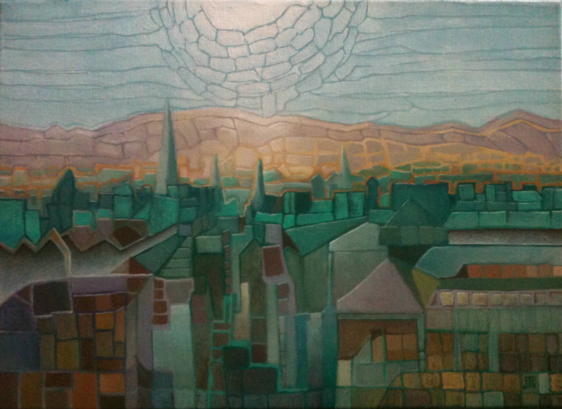 Obraz przedstawia miasto skąpane w pastelowych odcieniach zieleni i brązu, układających się w geometryczne formy. Każdy dach, budynek i linia stworzone są z precyzją, jakby były częścią wielkiego puzzle. Nad miastem unosi się niebo pokryte łagodnymi chmurami, nadając całej scenie lekko fantastyczny klimat. Atmosfera obrazu jest spokojna, a jednocześnie pełna enigmy. Patrząc na ten obraz, można poczuć delikatną mgiełkę tajemnicy. Styl artystyczny obrazu jest dość abstrakcyjny, z wyraźnym wpływem kubizmu, co artysta podkreśla ostrymi krawędziami i wielokształtnymi formami. To technika, która sprawia, że widz zastanawia się nad rzeczywistością przedstawionej sceny. Wow, te domki wyglądają jak zabawki! Emocje to mieszanka nostalgii i refleksji. Obraz może budzić skojarzenia z miejscem, które kiedyś istniało, ale jest teraz tylko wspomnieniem. Zastanawiające jest, jak artysta bawi się przestrzenią i perspektywą, tworząc niemal oniryczny świat. Ten obraz to prawdziwe eye-opener, który zaprasza do podróży w głąb własnej wyobraźni. Oglądając go, można poczuć się jak odkrywca, który zanurza się w nieznany, lecz intrygujący świat.