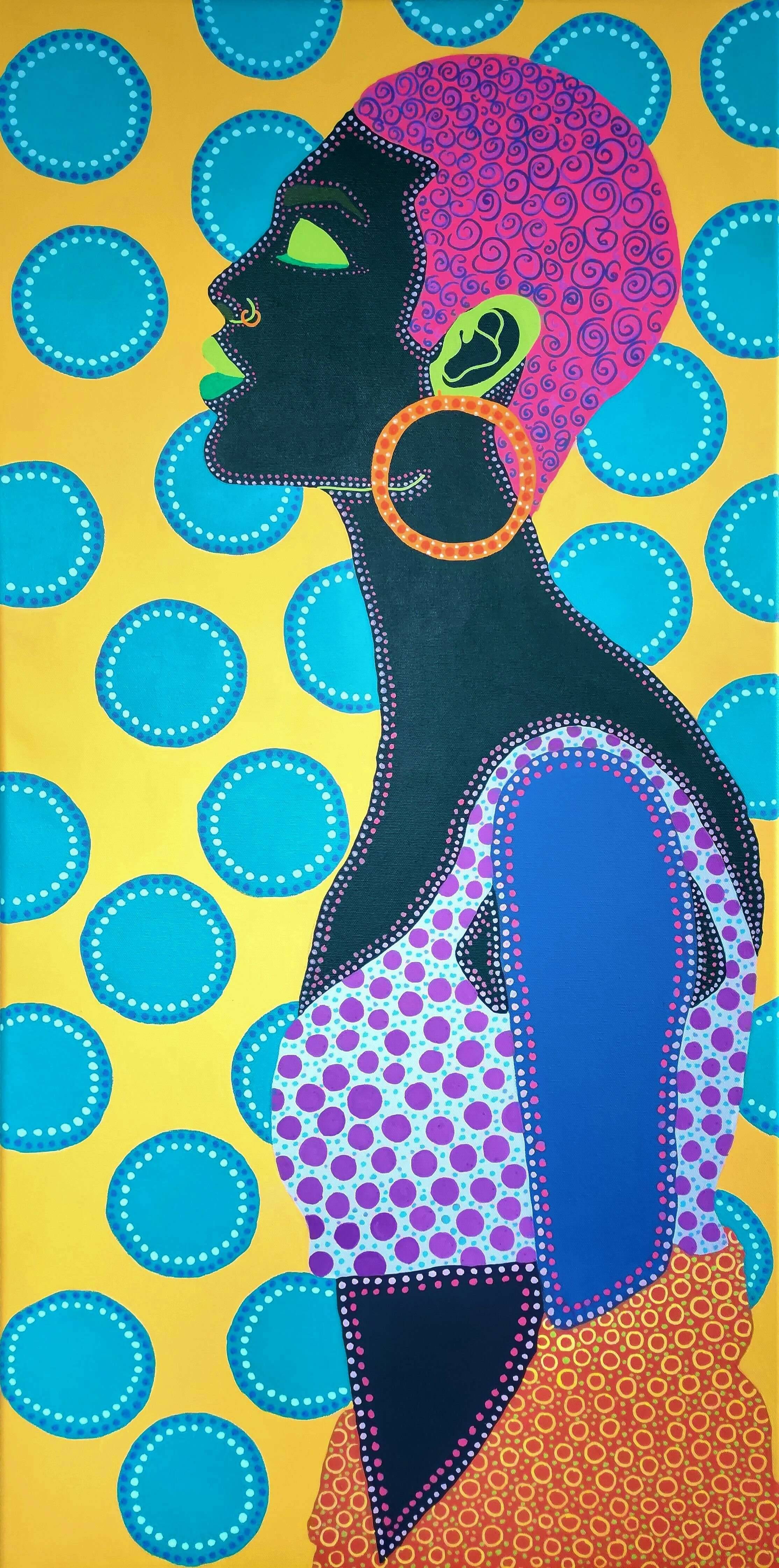 Obraz tętni życiem, pełnym intensywnych kolorów i wyrazistych kształtów. Dominują żółcie i turkusy, które tworzą kontrast z głęboką czernią sylwetki. Całość jest skomponowana z prostotą, ale jednocześnie z przemyślaną harmonią. Powierzchnia jest pokryta okręgami, które nadają tło dynamikę i niespokojny rytm. Atmosfera dzieła jest pogodna i pełna energii, trochę jak dzień na plaży z przyjaciółmi. Artysta korzysta z techniki plam barwnych i wyrazistych konturów, co przypomina nieco pop-art style. Pewnie ktoś by powiedział "Ale czad!" na widok tych kolorów. No bo jak tu nie czuć radości? Dzieło wywołuje uśmiech i zachęca do chwili refleksji, może trochę o identyfikacji i dumie. To jakby uczta dla zmysłów, gdzie każdy kolor mówi "Look at me!". Dziecko by powiedziało: "To jest jak mój rysunek, tylko ładniejszy". Obraz jest wielką dawką pozytywności i sztuki z przesłaniem, które zostaje z Tobą jeszcze długo po tym, jak od niego odejdziesz.