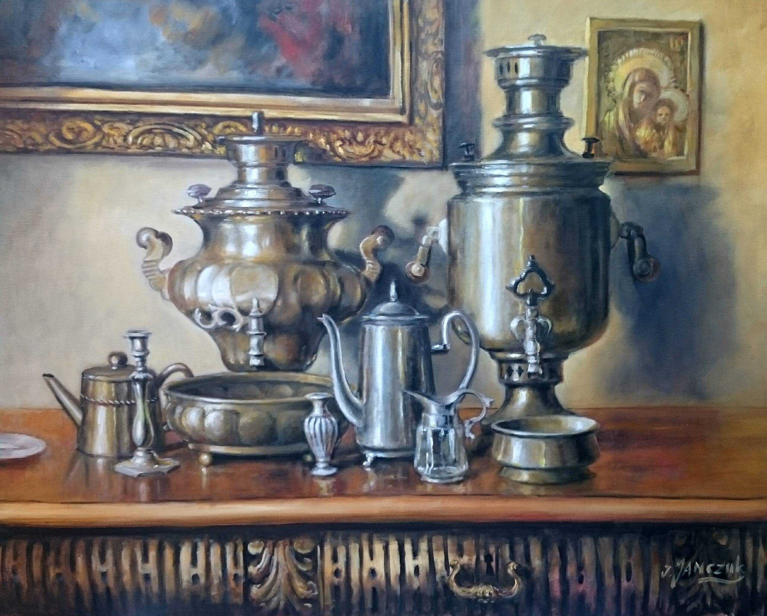 samowary na za zabytkowym kredensie z zestawem naczyń