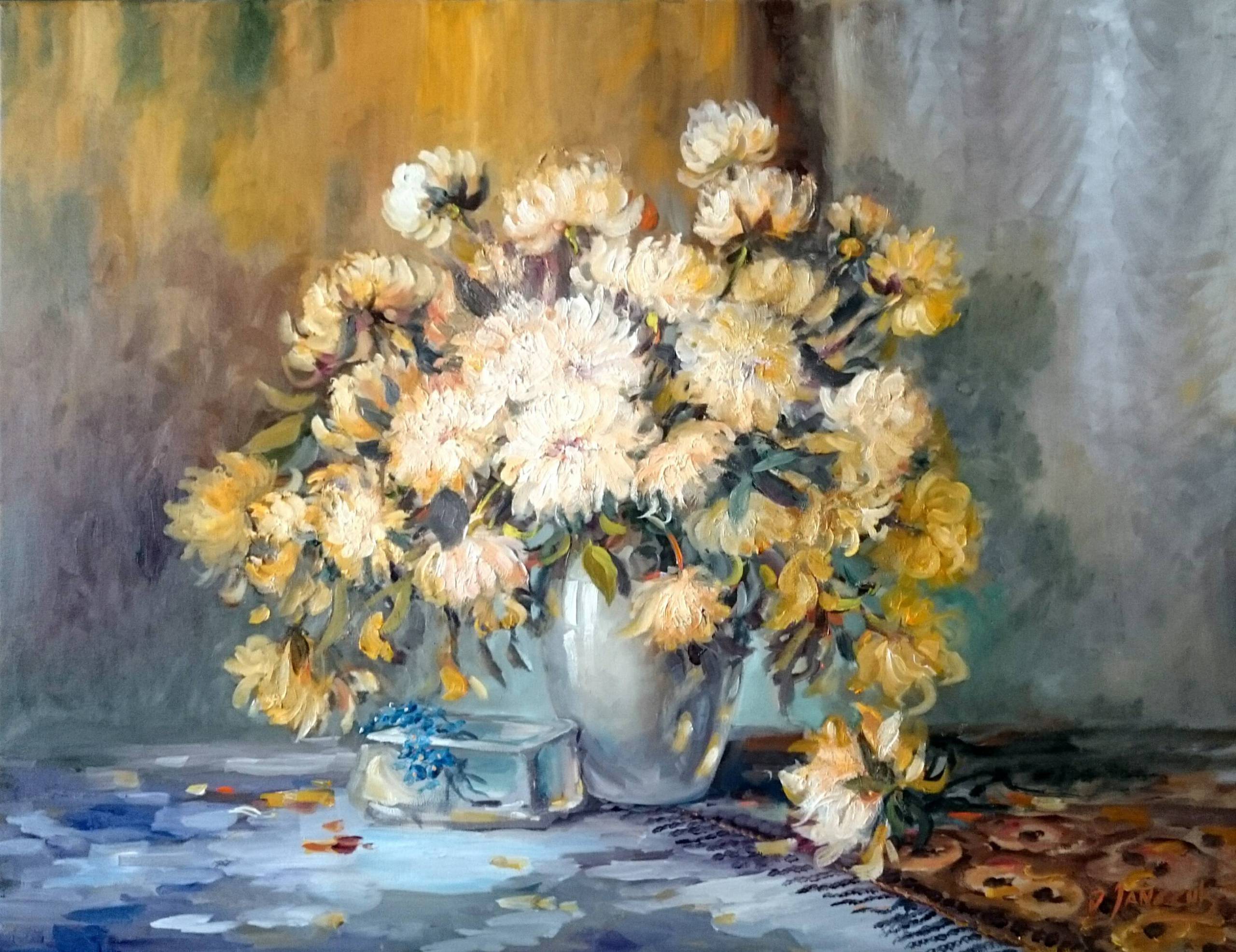 Obraz przedstawia wspaniałą kompozycję bukietu kwiatów w delikatnych, pastelowych odcieniach. Jasne kremowe i żółtawe płatki grają w harmonii z zielenią liści, tworząc barwny spektakl na tle stonowanej szarości i beżu. Całość sprawia wrażenie miękkiego, niemalże surrealistycznego snu. Artysta z wprawą posługuje się techniką impastu, co nadaje każdemu pociągnięciu pędzla teksturę i głębię. Kompozycja jest dynamiczna, kwiaty zdają się niemalże wyłaniać z płótna, jakby chciały dotknąć widza. To dzieło emanuje spokojem. Atmosfera jest nostalgiczna, a może nawet trochę romantyczna. Każdy patrzący na obraz może poczuć, jak wnętrze ich serca napełnia się ciepłem. Myślę sobie, że mały kotek mógłby się położyć obok, tak cicho jest i przyjemnie tutaj. Patrząc na ten obraz, czuje się echo przeszłości, jakby każdy kwiat opowiadał historię. Obraz jest pewnym "masterpiece", zatrzymuje na dłużej i zmusza do refleksji. Zachwyca techniczną precyzją i szczerością emocji, które wylewają się z każdym pociągnięciem pędzla. Jest tu coś magicznego, co sprawia, że czujesz się jak w dzieciństwie, gdy zasypiałeś na pachnącej łące. To jak chwila zatrzymana w czasie, której piękno trudno opisać słowami.