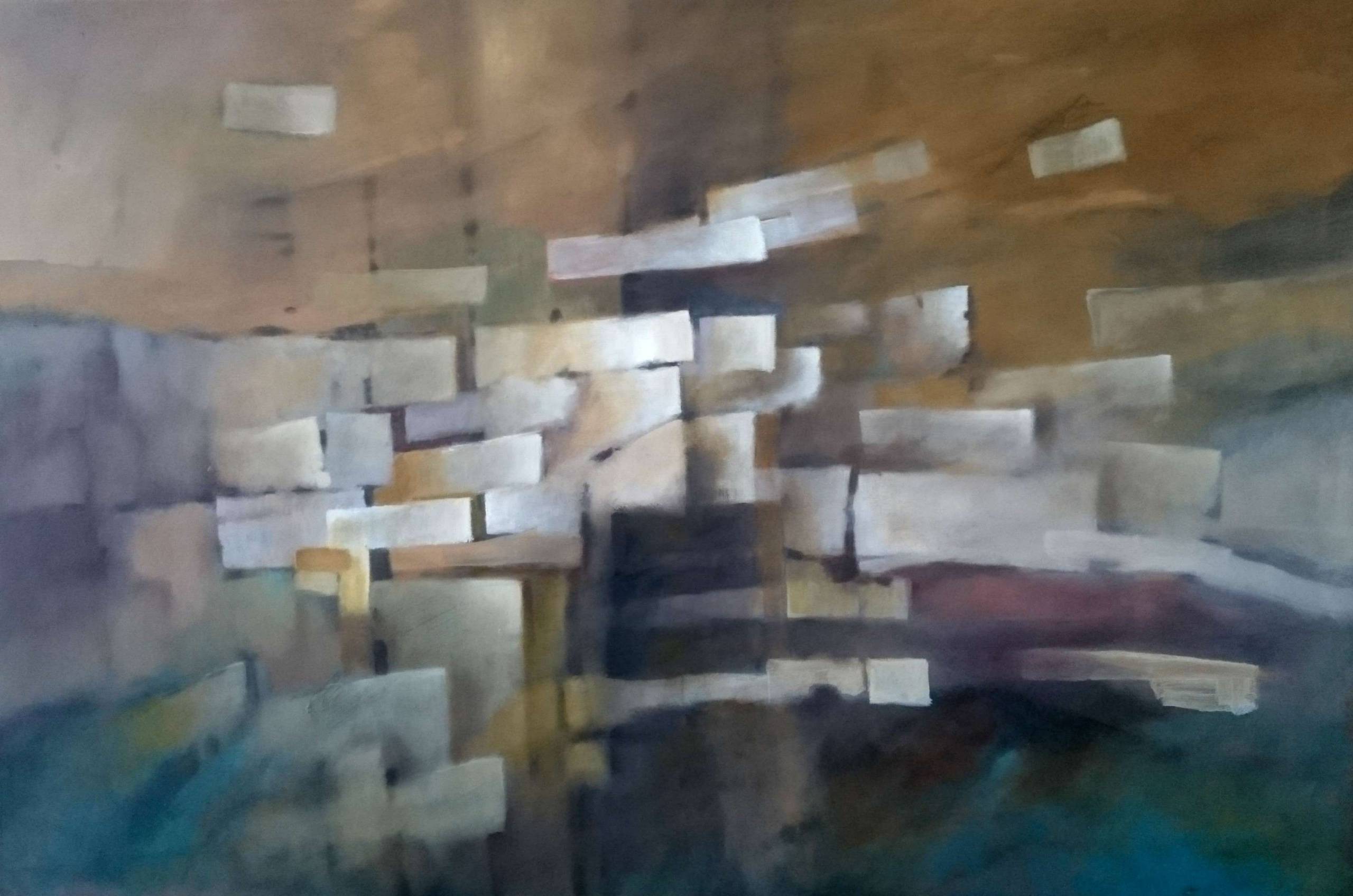Na obrazie dominują delikatne kolory ziemi, głównie beże, szarości i odcienie niebieskiego. Rozmyte prostokąty rozciągają się poziomo, tworząc iluzję ruchu i dynamizmu, jakby chwilę temu wszystko zaczęło się rozpadać albo układać na nowo. Kompozycja jest luźna, swobodna, a jednocześnie wprowadza pewien rytm, dzięki czemu widz może poczuć, jakby patrzył na taniec prostokątów. Atmosfera jest trochę tajemnicza, jakby ktoś nas zapraszał do odkrycia ukrytej historii. Całe dzieło emanuje abstrakcyjnym stylem, pełnym niedookreśleń. Artysta zastosował technikę przydymionych przejść, nadając obrazowi flou, które dodaje mu miękkości i eteryczności. Myślę sobie, że to jak patrzenie przez okno w mglisty dzień. Obraz może budzić wiele emocji – od spokojnej kontemplacji po niepokój związany z nieznanym. Wszystko zależy od tego, czy patrzymy na rozkład, czy na budowę. Chciałbym wiedzieć, co siedział w głowie autora podczas tworzenia. Ten obraz jest, jak kolorowy sen zmieszany z neutralnymi emocjami – a może tak? Nawet sam nie wiem, ale to jest w porządku. To takie softly unsettling. Dla mnie, to jakby obrazy chciały nas porwać do swojego świata i pokazać, że w zwykłym chaosie można znaleźć harmonię.