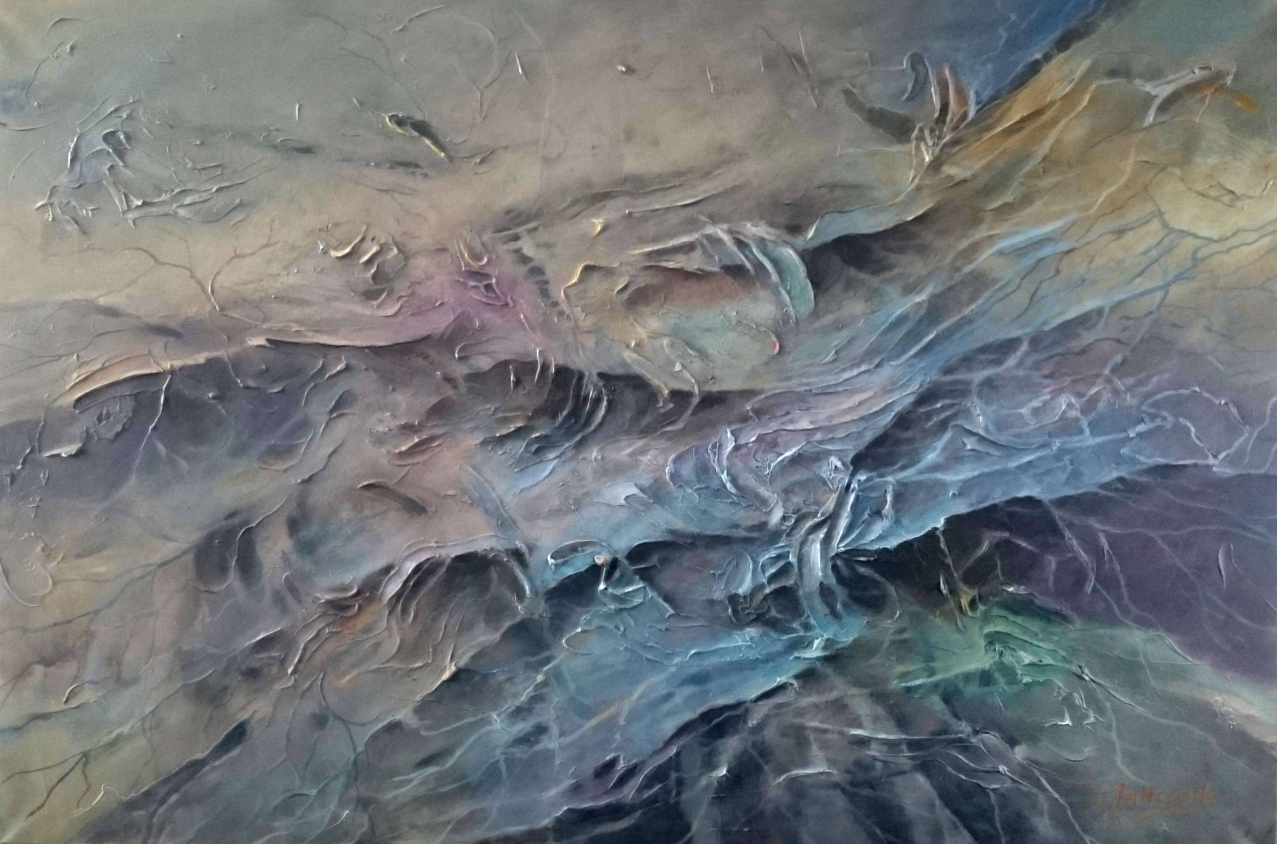 Ten obraz to prawdziwa symfonia dla oka, prawda? Pełen subtelnych kolorów, takich jak szarości przeplating with delikatnymi odcieniami niebieskiego i zielonego, tworzy prawdziwie mistyczny klimat. Kompozycja zdaje się być chaotyczna na pierwszy rzut oka, ale ma w sobie pewną harmonię. Linie i kształty wyglądają, jakby wyłaniały się z mgły, tworząc abstrakcyjne formy, które mogą przypominać fale morza lub tajemnicze krajobrazy. Nastrojowość tego dzieła jest nie do przecenienia. Emanuje z niego spokój, ale też pewna tajemnica, która sprawia, że widz jest zarazem zaintrygowany i odprężony. Styl artysty można określić jako abstrakcyjny, z wykorzystaniem technik impasto, co nadaje powierzchni głębi i tekstury. Patrząc na ten obraz, można poczuć chwilowe oderwanie od rzeczywistości. Jest jak portal do innego świata, gdzie wszystko jest możliwe. Ja bym tam chciał żyć! Obraz może budzić rozmaite emocje - od zachwytu po nostalgię. Dla mnie to przypomnienie, że w chaosie można znaleźć piękno i spokój.