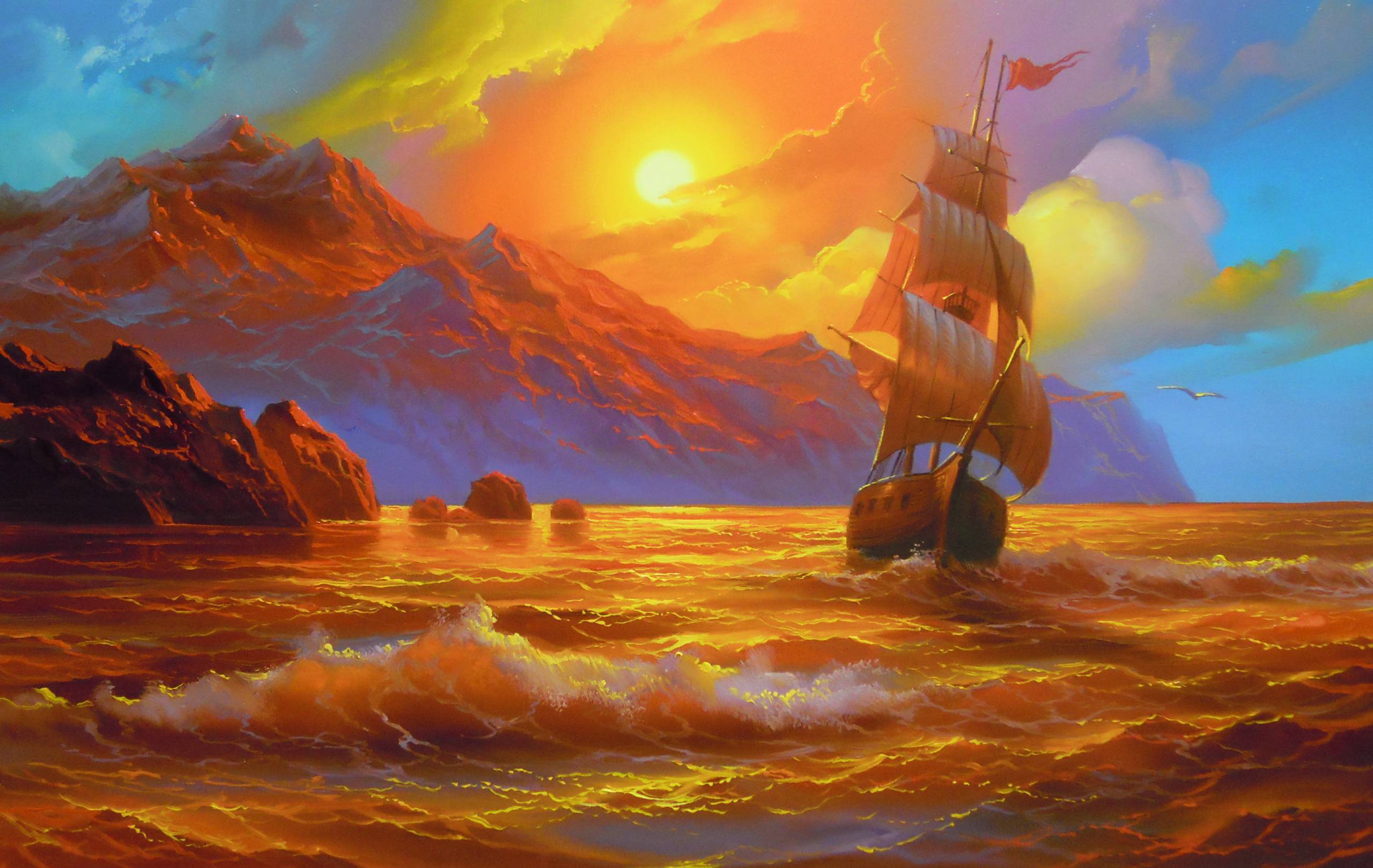 Na obrazie widzimy majestatyczny statek sunący po złocistym morzu, gdy słońce chyli się ku zachodowi, malując niebo w jaskrawe odcienie pomarańczu i złota. Chmury jakby płoną barwami, tworząc dramatyczny kontrast z chłodniejszymi niebieskimi tonami gór w tle. Kompozycja jest dynamiczna, statek wygięty lekko w lewo, jakby zaraz miał zatoczyć szeroki łuk, co przywodzi na myśl przygodę i tajemnicę. Atmosfera jest pełna ekscytacji, niemal słychać szum fal i szelest żagli. Artysta zastosował wyjątkowo żywe kolory i mocne kontrasty typowe dla stylu romantycznego. Technika mieszania barw nadaje obrazowi głębi i intensywności. Patrząc na ten obraz, można poczuć wołanie przygody, chęć odkrywania nowych horyzontów. A statek płynie, i płynie, jakby nic nie mogło go zatrzymać. Ciekawe, dokąd płynie ten magic boat i co kryją te odległe góry przysłonięte złotymi chmurami. To obraz, który rozbudza wyobraźnię, pozwala marzyć. Mała dziewczynka patrząc na obraz powiedziałaby: "Statek pływa po złotym morzu jak w bajce!".jajo