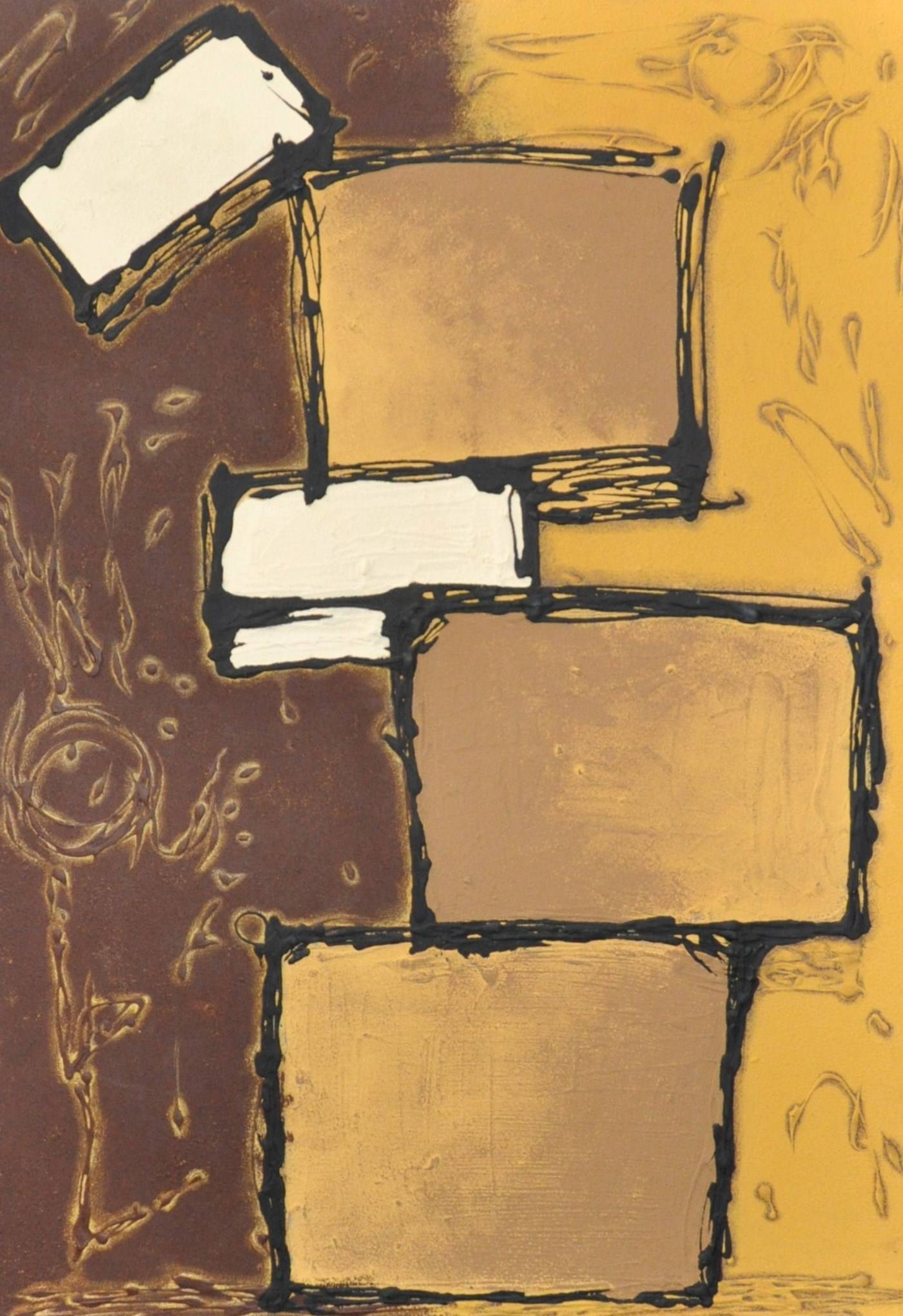 Na obrazie dominuje brąz i złamany żółty, przeplatane plamami ciemniejszego brązu oraz kremowej bieli. Kształty prostokątów wydają się zawieszone w chaosie, jakby artysta bawił się geometrią i strukturą. Każdy z nich jest delikatnie odrysowany czarną linią, która nadaje im wyrazistości. Kompozycja ta wydaje się być w rytmicznym nierównoważeniu, co dodaje jej dynamiki. Obraz emanuje spokojem i ciepłem, niczym jesienna nostalgia. Styl artystyczny przypomina współczesny ekspresjonizm z nutką abstrakcji (to jest to! "abstract", jakby powiedział Anglik). Kiedy patrzysz na obra, możesz odczuwać lekki niepokój, jakby coś znajomego się ukrywało. To jak gra w chowanego z własnymi myślami. Widz dostaje wolność interpretacji, co jest jednocześnie porywające i odrobinę przytłaczające. Małe dziecko mogłoby powiedzieć: "To wygląda jak wieża z klocków". Widzowie mogą poczuć przypływ ciekawości, zastanawiając się, co skrywa się za prostymi formami. Artysta posłużył się techniką grubych pociągnięć pędzla, co nadaje obrazowi teksturę niemal namacalną. Siedząc przed tym dziełem, czuć jak czas na chwilę zwalnia.