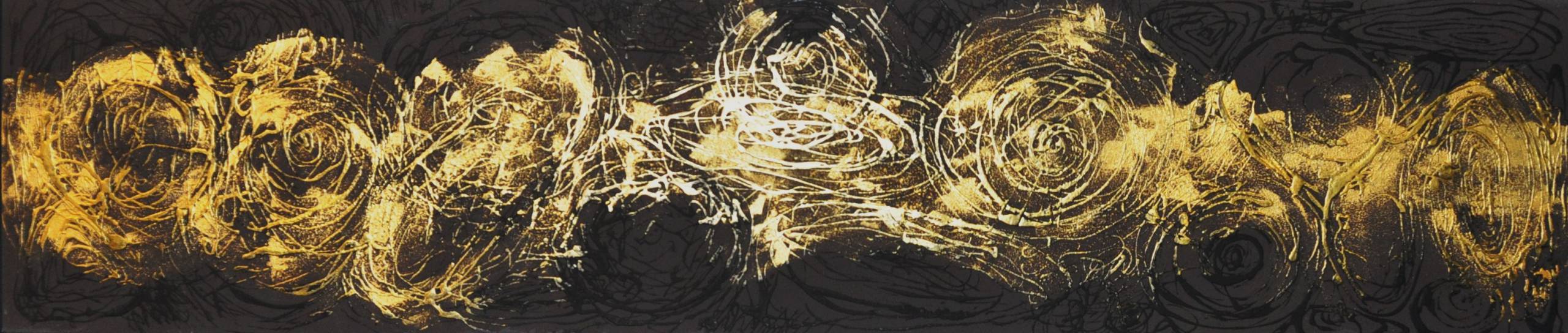 Na obrazie widać dynamiczną grę jasnego złota i głębokiej, mrocznej czerni. Złote wiry przypominają skomplikowane wzory, jakby ktoś zanurzył pędzel w miodzie i tworzył fantazyjne esy-floresy. Czerń, niczym nieskończona przestrzeń, otacza i podkreśla te lśniące kształty. Kompozycja przywodzi na myśl chaos przemieniający się w harmonię. Atmosfera dzieła jest pełna energii i tajemnicy. Styl artysty można by opisać jako abstrakcyjny ekspresjonizm. Technika jest pełna spontaniczności, jakby artysta tworzył w natchnieniu, bez wcześniejszego planu. Wywołuje to w odbiorcy uczucie zagubienia, ale też fascynacji. Jakby ktoś otworzył drzwi do innego wymiaru. Mały Jaś powiedziałby: Wygląda jak złote tornado! Obraz może budzić emocje zachwytu i refleksji o nieskończoności. Could it mean something more? Moim zdaniem, te wirujące bryły to emocje, które przeplatają się z naszymi myślami. Całość jest jak podróż w nieznane, pełna niespodzianek i zmian.