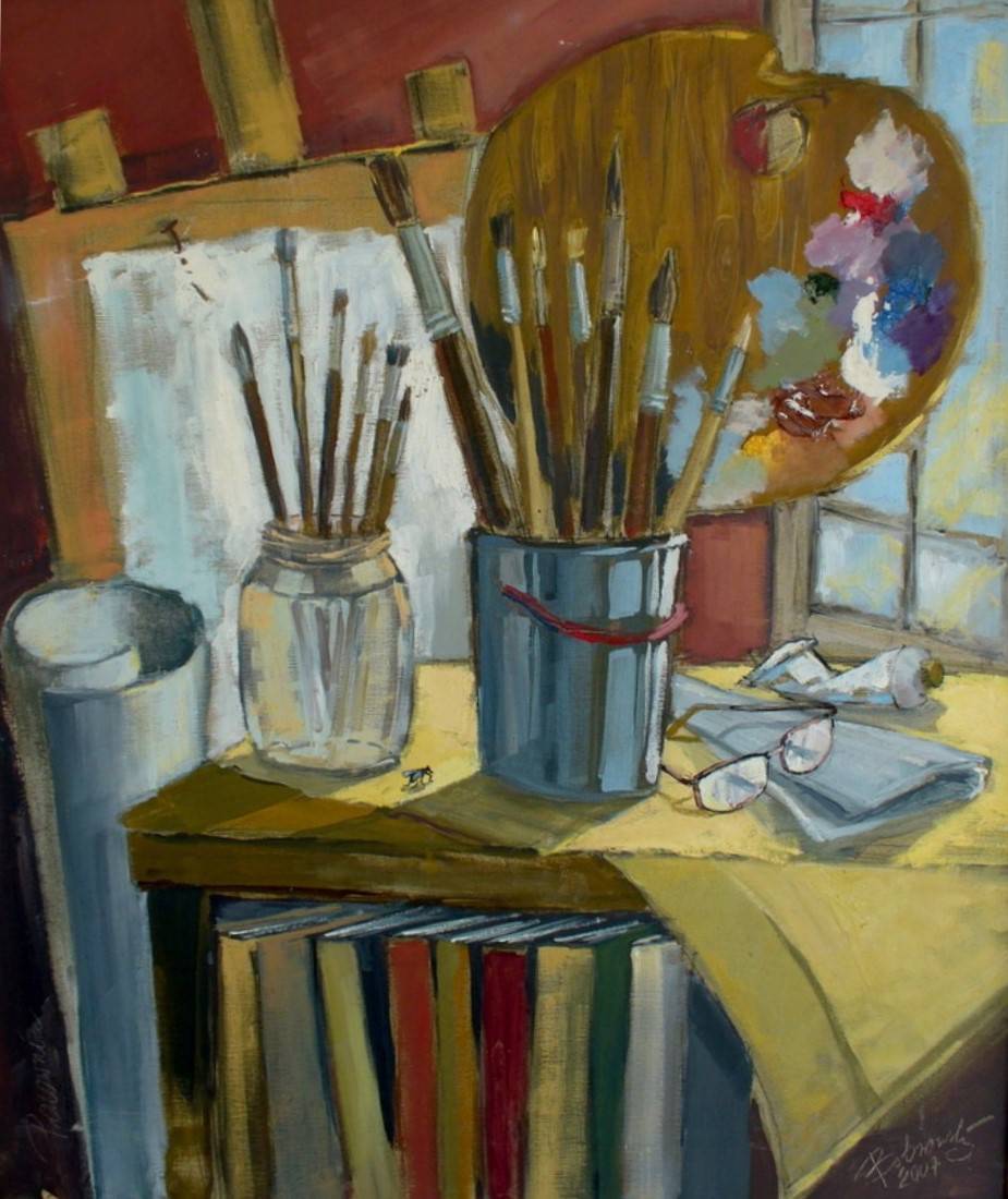 Obraz przedstawia artystyczny nieład, który jest pełen koloru i życia. Na pierwszym planie widzimy różnorodność pędzli, artystycznie upchniętych w słoiku i metalowym kubku. Półka z książkami, z której bije nostalgia za starymi czasami, znajduje się na dole. Dominują ciepłe, ziemiste barwy - brąz, żółć i odcienie czerwieni, które przeplatają się w harmonii. Jest też stara paleta malarska, pokryta plamami farb, gotowa do akcji. Czyż nie wygląda to trochę jak organizowany chaos? Panuje tu atmosfera spokoju i skupienia charakterystyczna dla pracowni artysty. Jakby ktoś dopiero co opuścił to miejsce, by chwilę odpocząć. Styl obrazu jest nieco surowy, a technika malarska - ekspresyjna. Można dostrzec szybkie pociągnięcia pędzla, które nadają dynamizm, jakby artysta uchwycił moment twórczy. To przypomina mi o tym, jak bardzo cenić należy takie "momenty". Obraz wywołuje mieszankę tęsknoty i inspiracji. Odbiorca może poczuć, że uczestniczy w procesie twórczym, prawie jakby sam miał zaraz przysiąść przy sztaludze. Dziecko powiedziałoby: „Ale fajne pędzle!” A ja myślę sobie, że każdy z nas ma w sobie trochę artysty, gotowego stworzyć swoje własne dzieło. To subtle touch of creativity może na chwilę zatrzymać czas i przenieść nas do innego świata.