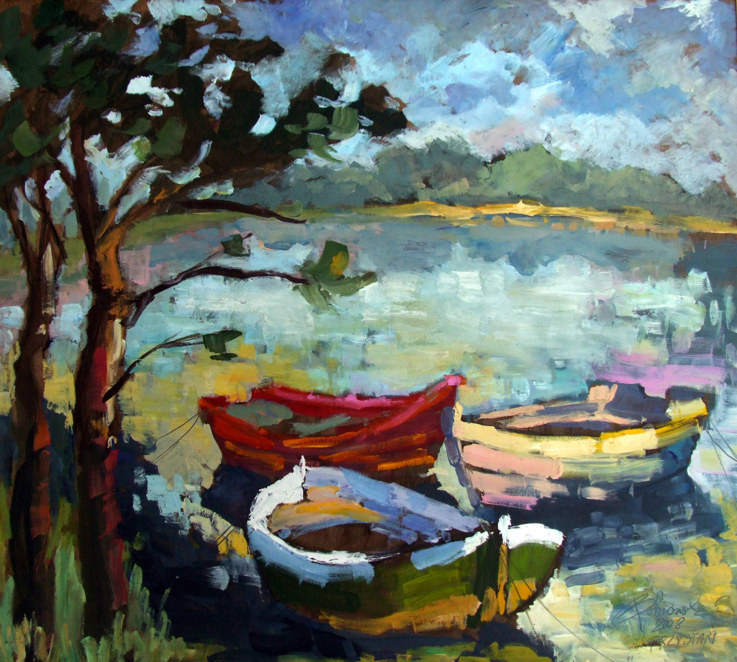 Na obrazie widać urokliwą scenerię: trzy łodzie spoczywające na spokojnej wodzie jeziora, skąpane w miękkim świetle dnia. Dominują ciepłe odcienie: czerwienie, zielenie i błękity, które wprowadzą harmonię i spokój. Drzewa na pierwszym planie, z gałęziami beztrosko sięgającymi w niebo, pochylają się lekko nad wodą. Dzieło emanuje atmosferą leniwej, letniej sjesty, jakby zatrzymał czas na moment. Impresjonistyczne uderzenia pędzla artysty, pełne dynamiki i kolorów, nadają głębi i witalności kompozycji. Obraz tchnie marzycielskim nastrojem, przypomina beztroskie dni dzieciństwa, kiedy świat był pełen tajemnic. Kto by nie chciał popłynąć jedną z tych łodzi ku nieznanym przygodom? Może te łodzie to jak symbol wolności? Kto wie. Plamy kolorów tworzą wrażenie ruchu, jakby wszystko było lekko rozmazane, ale zarazem niezwykle realne. Wciąga widza w swoją opowieść, prowokując do zadumy i refleksji. Patrząc na ten obraz, można poczuć tzw. "relaxation mode". Dzieciak powiedziałby: "Chciałbym tam pływać", i myślę, że wielu dorosłych by się z nim zgodziło. Emocjonalnie czułem się przeniesiony do krainy spokoju, gdzie codzienne problemy znikają. Jest w tym obrazie coś magicznego, coś, co sprawia, że chcesz na chwilę przystanąć i zwyczajnie popatrzeć.