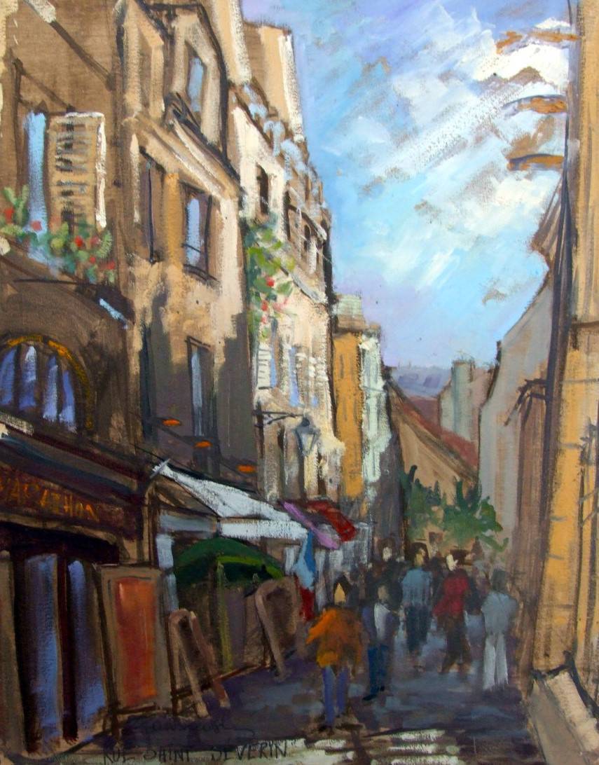 Obraz przedstawia tętniącą życiem uliczkę pełną ludzi, gdzie dominują odcienie brązów, zieleni i błękitów. Budynki są wysokie, wąskie, a ich fasady zdobione są kwiatami. Kompozycja prowadzi wzrok wzdłuż ulicy, która zwęża się ku horyzontowi. Jasne, błękitne niebo kontrastuje z ciepłymi barwami budynków, tworząc wrażenie słonecznego dnia. Atmosfera obrazu jest pełna życia i dynamizmu, jak w busy city. Ruch i migoczące światło stworzone przy pomocy szybkich, niemal szkicowych pociągnięć pędzla dają uczucie energii i ruchu. Styl artysty jest luźny, impresjonistyczny. Delikatne, niemal przypadkowe uderzenia pędzla dodają scenie spontaniczności. Dzięki tej technice odbiorca ma wrażenie, jakby stał w samym środku tej uliczki. Może poczuć zapach piekarni, usłyszeć rozmowy i śmiechy przechodniów. "Chciałbym tam być!", powiedziałby 7-latek. Artysta uchwycił chwilę codziennej krzątaniny, która na długo pozostaje w pamięci. Obraz wywołuje nostalgię, przypominając o uroku spontanicznych miejskich spacerów, których czasem nam brakuje w codziennym życiu.