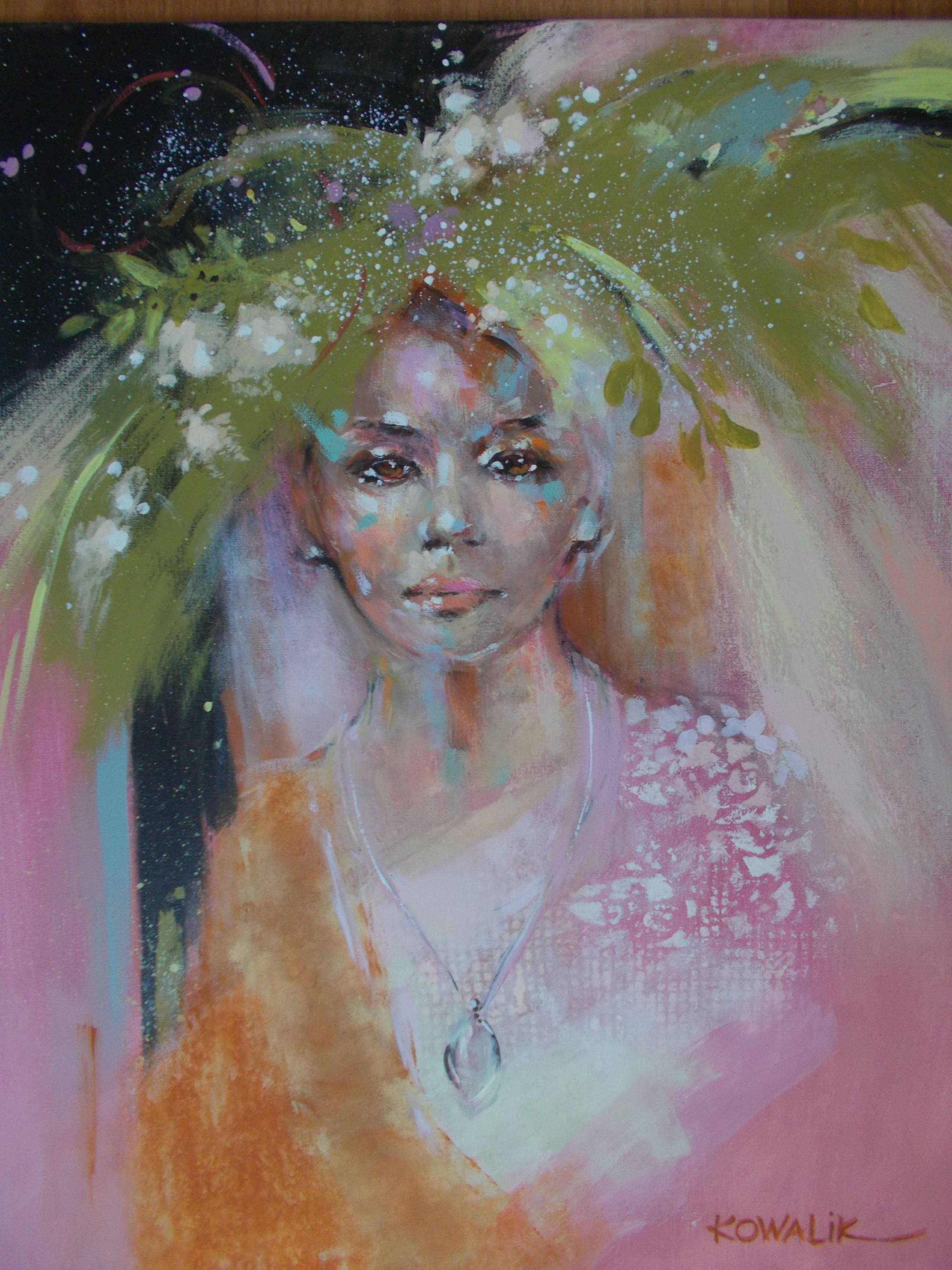 Obraz emanuje ciepłem i tajemnicą. Dominują na nim delikatne, pastelowe kolory - róż, zieleń oraz złociste odcienie, które tworzą aurę lekkości i marzeń. Postać w centrum, z subtelnym uśmiechem, zdaje się patrzeć prosto w duszę obserwatora. Jej spojrzenie jest spokojne, a oczy zdają się opowiadać historie niewypowiedziane. Kompozycja obrazu skupia się na twarzy otoczonej eksplozją barw przypominających kwiaty czy eteryczną mgłę. Styl artystyczny jest pełen swobody, jakby artysta malował duszą. Dynamiczne pociągnięcia pędzla nadają całości energii, a delikatne detale twarzy kontrastują z abstrakcyjnym tłem. Technika łączy realizm w rysunku portretowym z abstrakcyjną interpretacją otoczenia. Emocje wywołane przez obraz są różnorodne: od nostalgii po radość. Można poczuć, że to dzieło eksploruje granice między rzeczywistością a fantazją. "It feels like a dream" - chciałoby się powiedzieć, oglądając te barwy i formy. Jedenastolatka patrząc na to dzieło mogłaby powiedzieć: patrzy jak ktoś bardzo mądry. Atmosfera obrazu jest magiczna, a jednocześnie niewymuszona, niczym melodia zapomnianej piosenki, którą chcesz zanucić jeszcze raz.