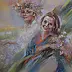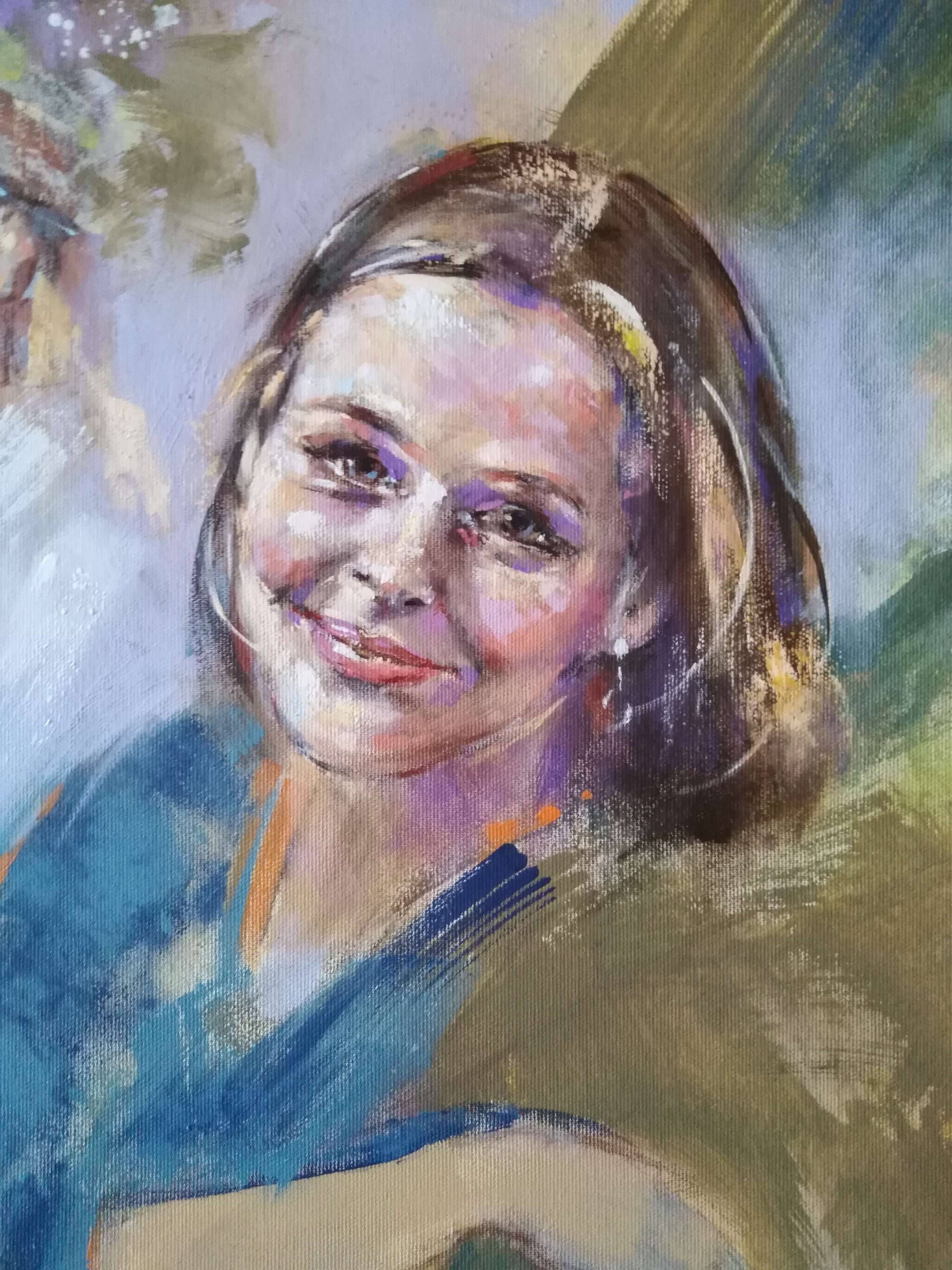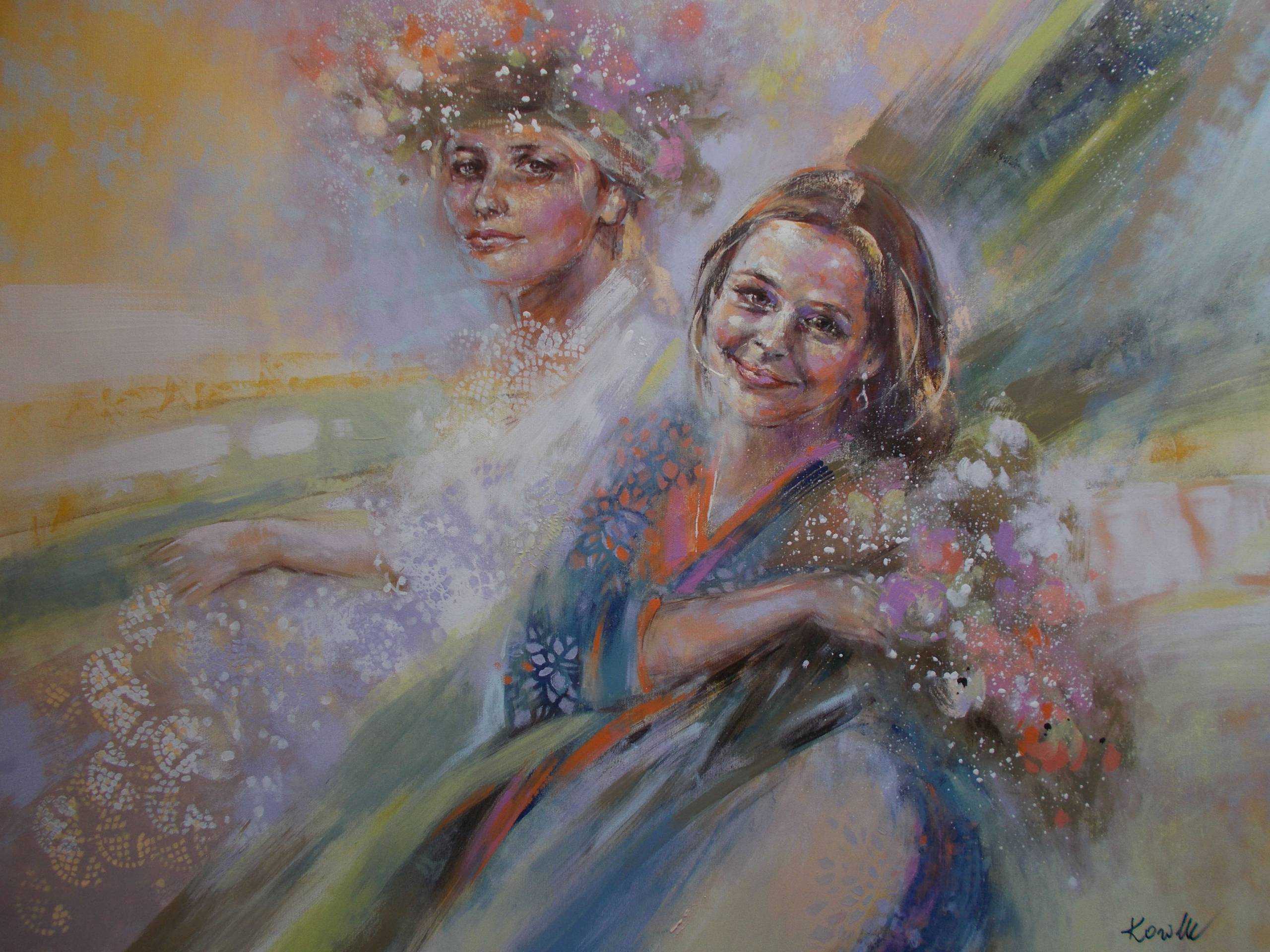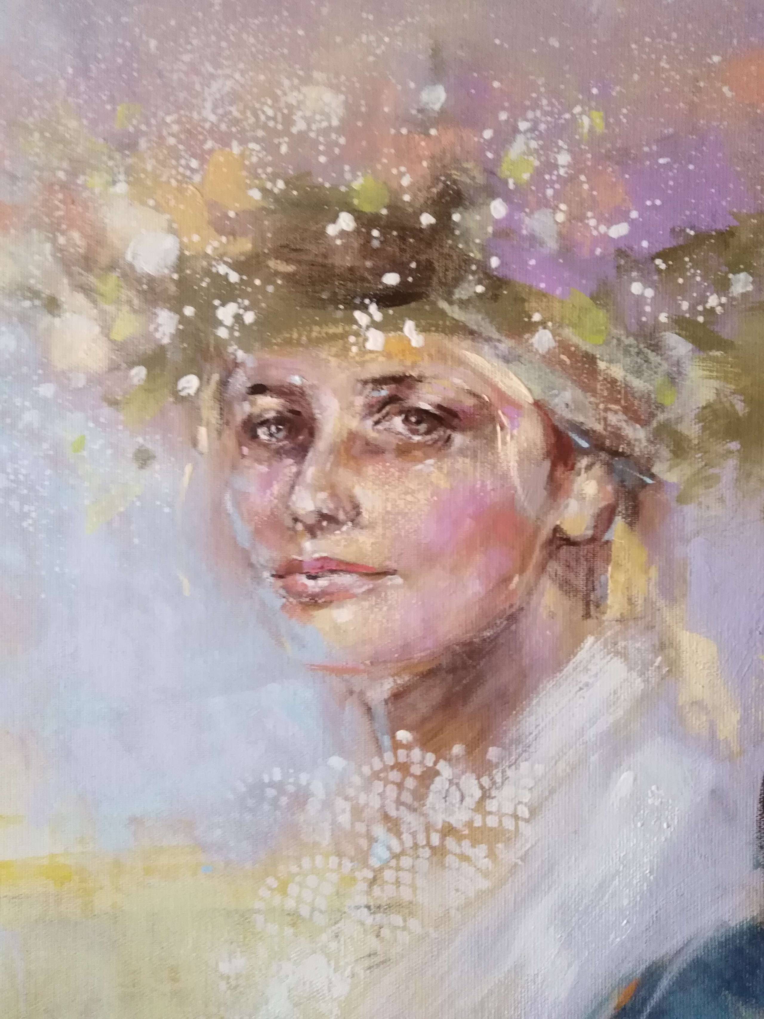 Na obrazie dominują pastelowe kolory, które tworzą harmonijną i pełną ciepła atmosferę. W centrum widnieją dwie kobiety, których delikatne twarze emanują spokojem i radością. Tło pełne jest subtelnych odcieni żółci, zieleni i błękitu, które płynnie się przenikają, nadając kompozycji lekkiego, niemal eterycznego charakteru. Styl artystyczny to mieszanka impresjonizmu z elementami abstrakcji. Artysta użył miękkich pociągnięć pędzla, które dodają obrazowi dynamiki i ruchu. Technika ta sprawia, że kobiety zdają się być częścią otaczającej ich przyrody, niemal jakby były utkaną z mgły wizją. Twarze, choć wyraźne, są otoczone delikatnym rozmyciem, co dodaje tajemniczości. Obraz budzi uczucie nostalgiczną, ale radosną reminiscencją. Dla mnie to jak wspomnienie letnich, beztroskich dni. Wow, to świetny obraz, mamo! A u ciebie? Może wywołać tęsknotę za chwilami spędzonymi z bliskimi lub marzenie o przyszłych, pogodnych dniach. Ta praca to prawdziwy "refreshing view"! Za każdym razem, gdy na nią patrzę, czuję coś innego, jakbym odkrywał nowe detale i emocje.