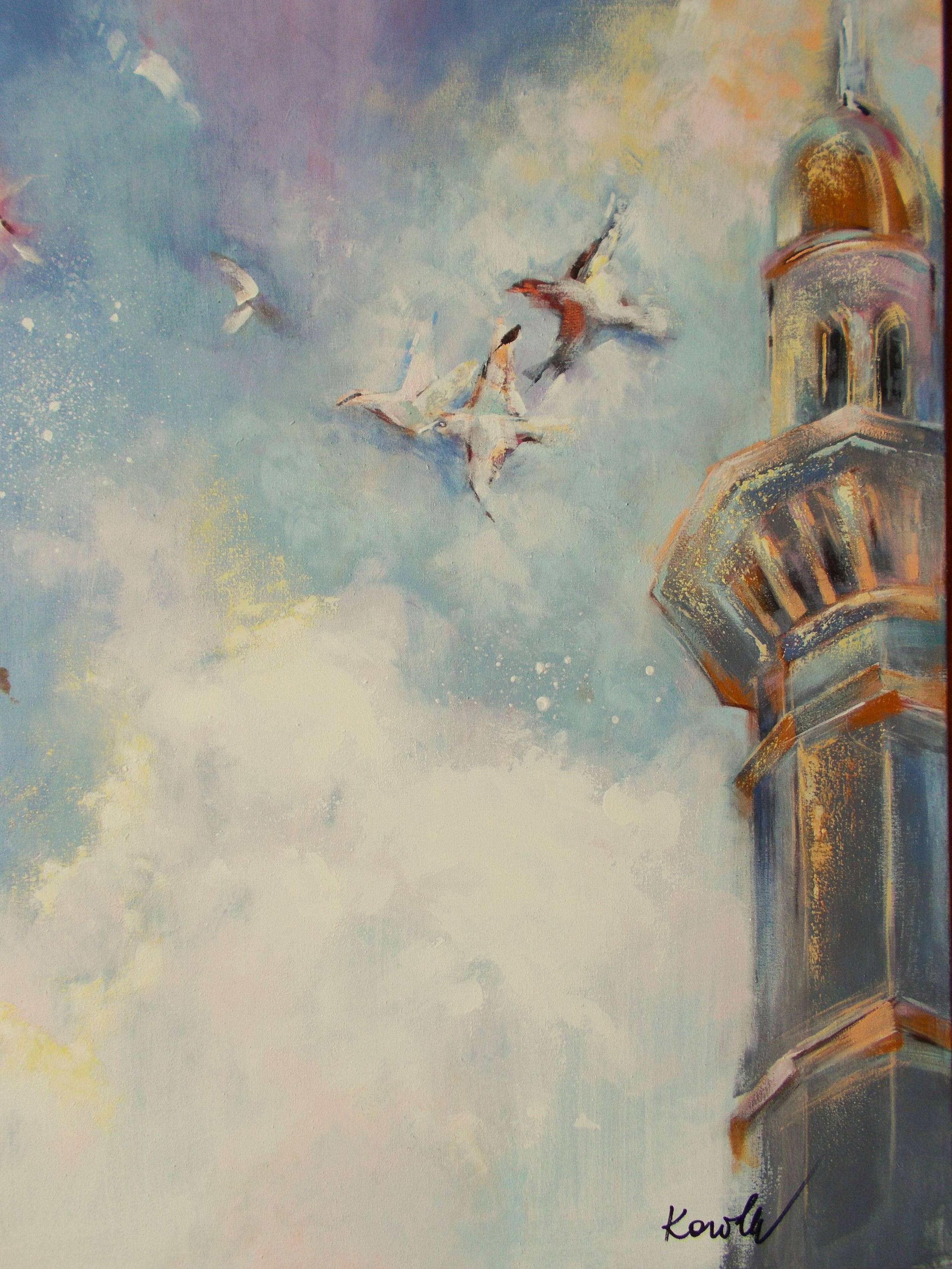 Na obrazie widzimy delikatnie roztopione barwy nieba. Przewaga błękitu miesza się z odcieniami różu i pomarańczy. W centrum uwagi jest majestatyczna wieża. Chociaż trochę rozmyta, przyciąga wzrok bogactwem detali architektonicznych. Obok, kilka ptaków unosi się w locie, dodając życia i dynamizmu całej scenie. Atmosfera tego dzieła jest spokojna, jak letni poranek, gdy powietrze jest jeszcze świeże. Nastrój można by określić jako dreamlike, pełen subtelnej magii. Artysta zastosował technikę impresjonizmu, co widać w sposobie, w jaki kolory się przenikają, tworząc niemal efemeryczne wrażenie. Pociągnięcia pędzla są miękkie, jakby pieszczące płótno. To może wywołać uczucie nostalgii i przypomnieć o dawnych letnich dniach spędzonych na wsi. „Ptaki lecą wysoko!” – mogłoby powiedzieć dziecko, widząc ten obraz. Zastanawiam się, co one widzą z tej wysokości? Może całkiem nowy świat. To dzieło jest jak melodia, którą można słuchać bez końca. Osobiście czuję spokój, patrząc na te kolory i kształty.