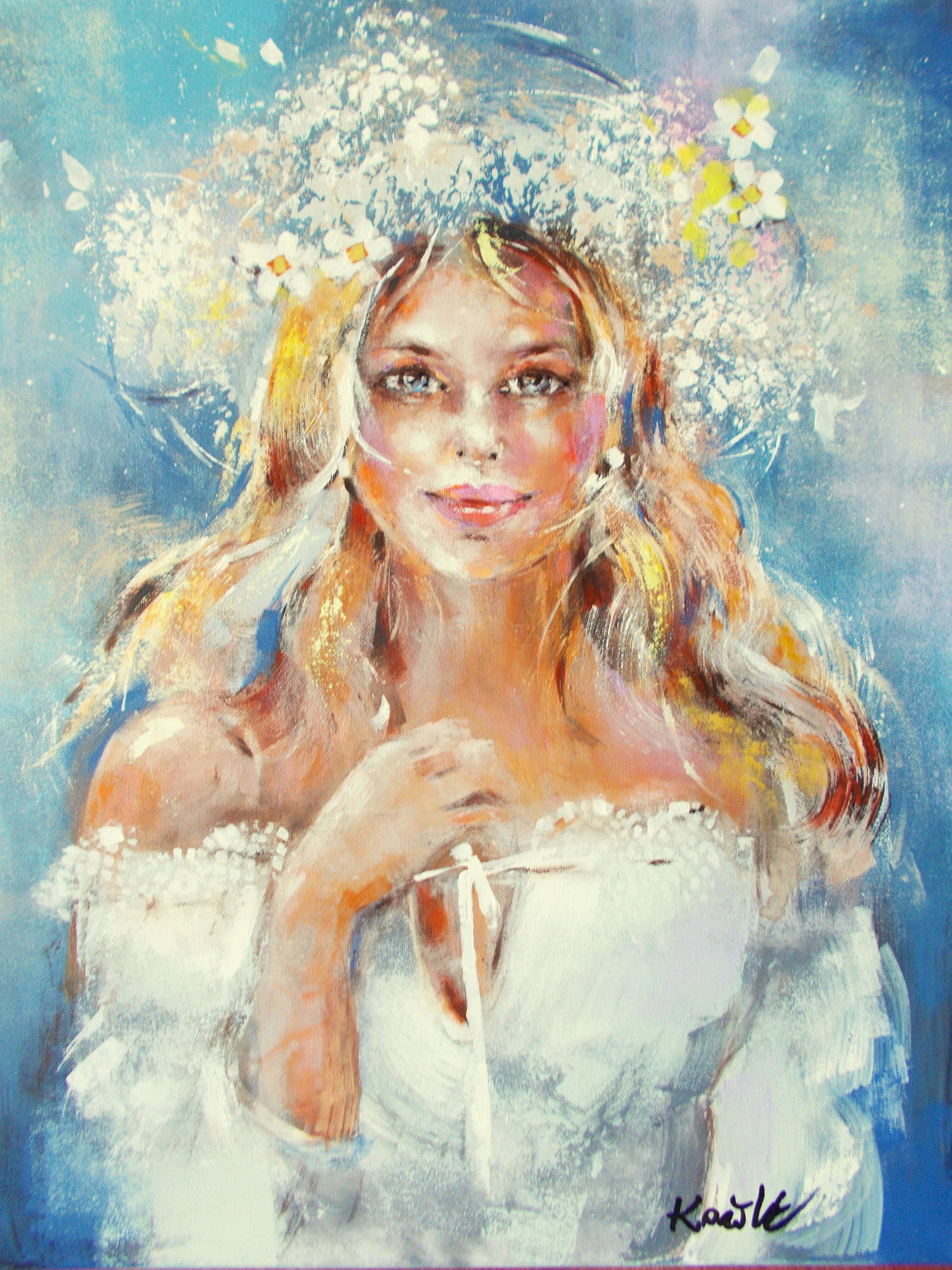 Ten obraz przedstawia młodą kobietę w subtelnym, baśniowym klimacie. W tle dominuje delikatny niebieski, jakby pochmurne niebo tuż przed letnią burzą, kontrastując z jasną kolorystyką jej postaci. Artysta z pewnym urokiem splatał włosy bohaterki ze złotą poświatą, która dodaje jeszcze więcej magiczności do tej kompozycji. Jej suknia z białym koronkowym wzorem jest jakby zrobiona z pianki – a do tego kwiaty wplecione we włosy. Obraz wręcz tchnie spokojem i niewinnością, emanuje ciepłem i spokojem, jak letnie popołudnie na łące. Artystyczny styl jest, jakby to powiedzieć, oniryczny. Swobodne pociągnięcia pędzla i pastelowa paleta sprawiają, że całość wygląda niczym sen. Technika, jaką zastosowano, wydaje się lekko rozmyta. Może wywoływać u odbiorcy nostalgiczne wspomnienia o dzieciństwie i prostych radościach, jak spacer wśród kwiatów. Obraz ma w sobie jakąś nieuchwytną "joy", która zaprasza do chwilowego zatrzymania się w biegu codzienności. Spoglądam i czuję, jakbym sam był dzieckiem, biegającym boso po kwiecistej polanie. Jest cudownie!