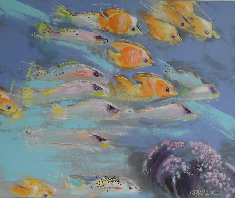 Obraz przedstawia dynamiczną kompozycję, gdzie kolorowe ryby płyną w jednym kierunku. Królują tu odcienie pomarańczowego i żółtego, które kontrastują z niebieskim tłem. Każdy kształt jest delikatnie rozmyty, co dodaje ruchu i energii, jakbyśmy byli pod wodą. Atmosfera jest spokojna, a jednocześnie pełna życia. Taki "underwater delight", można by rzec. Artysta użył techniki pasteli, której miękkość świetnie oddaje płynność wody. Ryby wyglądają jakby się uśmiechały, co wywołuje radość u odbiorcy. Nawet 7-latek mógłby powiedzieć: "Tu jest jak w akwarium!". Każdy detal jest przemyślany, co pokazuje talent i dbałość o szczegóły twórcy. Styl obrazu jest lekki i spontaniczny, jakby ktoś uchwycił chwilę z życia oceanu. Kiedy patrzę na to dzieło, czuję spokój i radość. Przypomina mi to letnie dni spędzone nad wodą. Niesamowita paleta kolorów przyciąga wzrok, a harmonijna kompozycja zachęca do zanurzenia się w tym pięknym podwodnym świecie. To obraz, który emanuje beztroską i zaraża pozytywną energią.