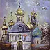 Obraz przedstawiający majestatyczne kopuły cerkwi zdaje się emanować spokojem i błogością. Złote i błękitne wieżyczki połyskują w delikatnym świetle, otulone pastelowym, niemal eterycznym tłem. Niebieska kopuła, zdobiona złotymi wzorami, przyciąga wzrok, jakby mówiła: "Patrzcie na mnie!". Połączenie ciepłych złocieni z chłodnym błękitem tworzy harmonię, uspokajającą jak muzyka klasyczna. Obraz ma atmosferę nostalgii, jak gdyby artysta zatęsknił za dawnymi czasami. To mieszanka realizmu i impresjonizmu, widoczna w subtelnych pociągnięciach pędzla i rozmytych konturach. Czyż nie przypomina bajki o latających żurawiach? Ich lekkość zdaje się tańczyć z wiatrem. Wow, such beauty! Odbiorca może tu poczuć moment spokoju, jakby zasiadł na ławeczce przed cerkwią, obserwując chmury przepływające spokojnie po niebie. Ten obraz jakby szeptał do serca, że warto czasem się zatrzymać. Słodka mieszanka old-world charm i współczesnej techniki wywołuje uśmiech. Patrząc na dzieło, siedmiolatek powiedziałby: "Te złote domki są jak z bajki!".