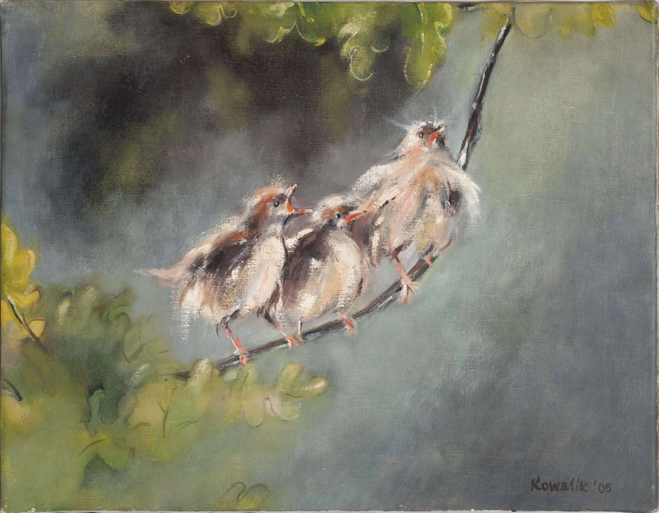 Obraz przedstawia trzy małe ptaki siedzące na gałęzi, otoczone zielenią liści. Widzimy delikatne pociągnięcia pędzla, które tworzą miękki, rozmyty efekt. Kolory są stonowane, dominują odcienie zieleni, brązu i delikatne biele na upierzeniu ptaszków. Atmosfera jest spokojna, jakby czas stanął w miejscu. Ptaszki wyglądają na zaskoczone, może trochę ciekawe świata. Czyż nie wydają się takie urocze, jakby właśnie odkryły coś nowego? Styl artystyczny przypomina impresjonizm, z delikatnymi, miękkimi przejściami pomiędzy kolorami. Technika ta nadaje obrazowi dreamy, magiczny charakter. Odbiorca może poczuć dziecięcą radość i beztroskę, przypomnieć sobie chwile, kiedy wszystko wydawało się niezwykle proste. Te ptaszki tak trochę jak z bajki są, prawda? Zastanawiając się nad emocjami, jakie budzi ten obraz, można poczuć radość i spokój. Kompozycja zachęca do zatrzymania się na chwilę i zanurzenia w spokojnym świecie natury. Patrząc na te ptaszki dziecięcymi oczami, ktoś mógłby pomyśleć: "Ojej, jakie one są słodkie!". A teraz, imagine, że sam jesteś jednym z tych ptaszków, co byś wybrał, patrzeć do przodu czy w bok? Takie rozważania mogą wywołać uśmiech i chwilę refleksji.