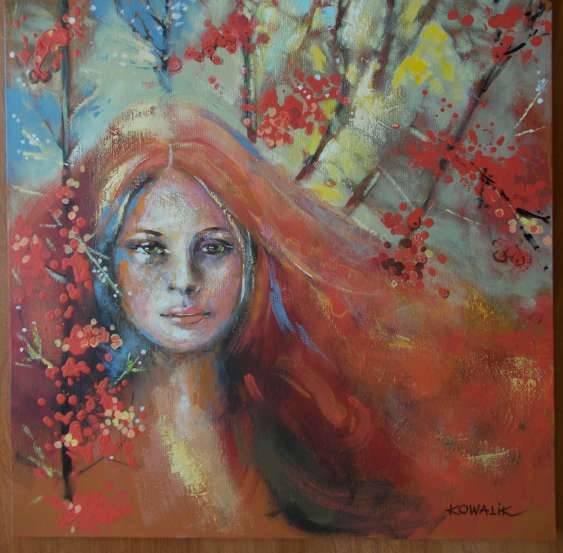 Obraz ukazuje młodą kobietę o długich, płomiennych włosach, subtelnie zatopioną w otoczeniu kolorowego lasu. Ciepłe odcienie czerwieni i pomarańczu dominują, tworząc aurę jesiennej baśni. Czerwonawe gałęzie pełne są delikatnych kropek przypominających jagody, a tło obrazu to mieszanina błękitów i szarości, nadająca głębi i tajemniczości. Kompozycja jest dynamiczna i swobodna, jakby włosy kobiety płynęły na delikatnym wietrze. Nastrój jest melancholijny, ale jednocześnie pełen magii i spokoju. To tak, jakby artysta chciał uchwycić chwilę zawieszenia między snem a rzeczywistością. Technika malarstwa wydaje się być mieszanką impresjonizmu i ekspresjonizmu, z nieco rozmytymi krawędziami i żywymi akcentami kolorystycznymi. Obraz może wywoływać emocje zadumy i refleksji nad naturą i pięknem ulotnych chwil. Może też przypominać o marzeniach i tęsknotach. Zastanawiam się, what if to ja jestem tą kobietą w lesie, co bym wtedy czuła? To jak bajka, powiedziałoby na pewno dziecko. Czuć tu bliskość z naturą i ulotność chwil życiowej przygody.