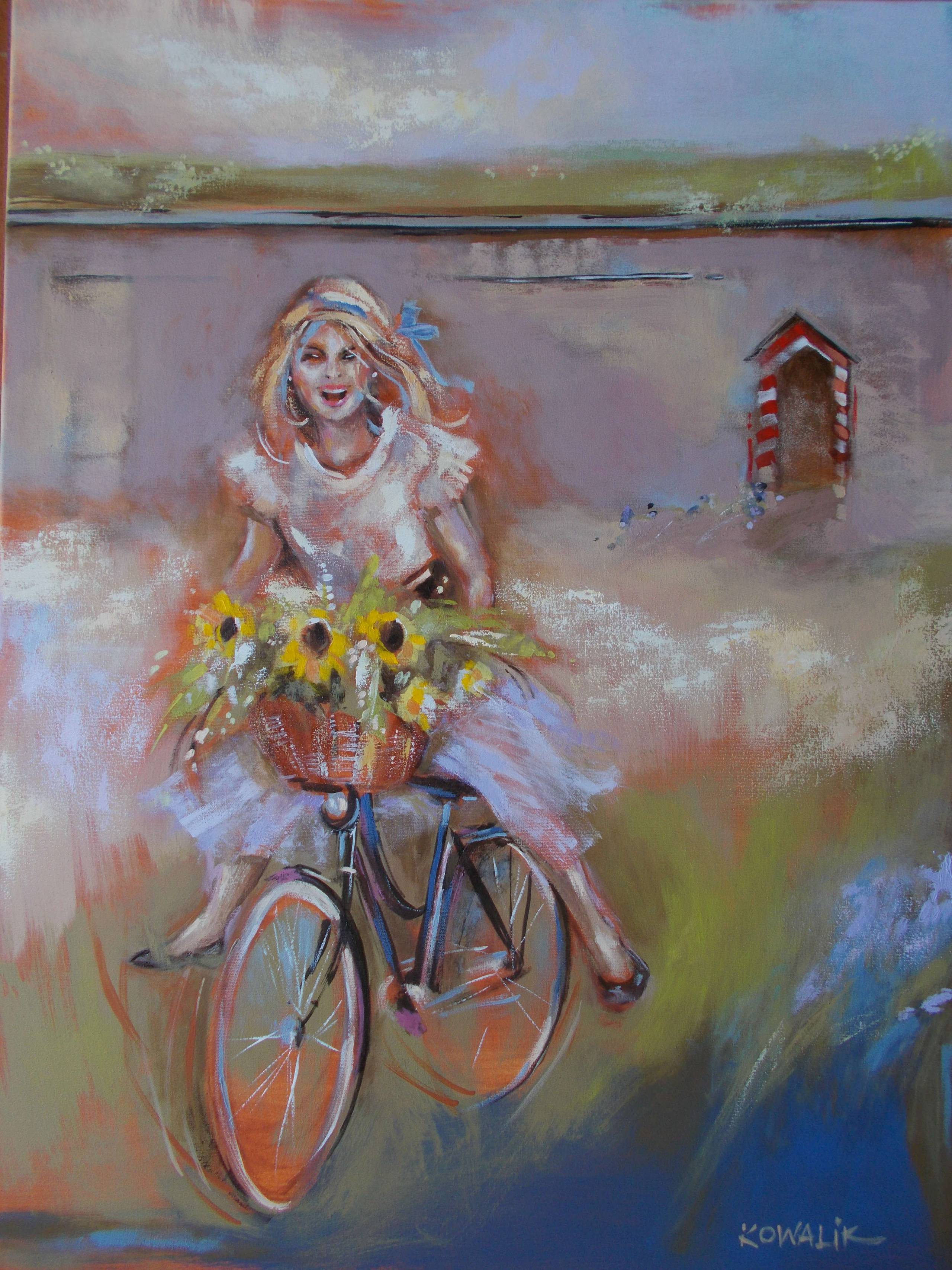 Na obrazie widzimy młodą kobietę na rowerze, która jedzie przez malowniczy krajobraz. Dominuje kolorystyka pastelowa – delikatne brązy, zielenie i błękity, które tworzą harmonijną całość. Jej sukienka falująca na wietrze dodaje lekkości i dynamiki. Kosz pełen słoneczników wydaje się wręcz żywy, przepełniony energią i ciepłem. W tle widać prostą architekturę, która kontrastuje z żywiołową sceną na pierwszym planie. Obraz emanuje radością i beztroską. To jak letni dzień pełen słońca. W stylu artysty dostrzegamy miękkie pociągnięcia pędzla, które nadają dziełu impresjonistyczny charakter. Technika ta doskonale oddaje ulotność chwili, zatrzymując ją w magicznym momencie. Wywołuje to u widza uczucie nostalgii i marzenia o wolności. „Chciałbym też tak jechać szybko!”, mógłby powiedzieć siedmiolatek podziwiający ten obraz. Łącząc w sobie dreamlike atmosferę z prostotą, artysta zabiera nas w podróż pełną emocji i refleksji. Obraz ten jest jak okno do innego świata, przypominający o urokach codziennych chwil. Po prostu magic. Zachęca do zatrzymania się i docenienia drobnych momentów w życiu.