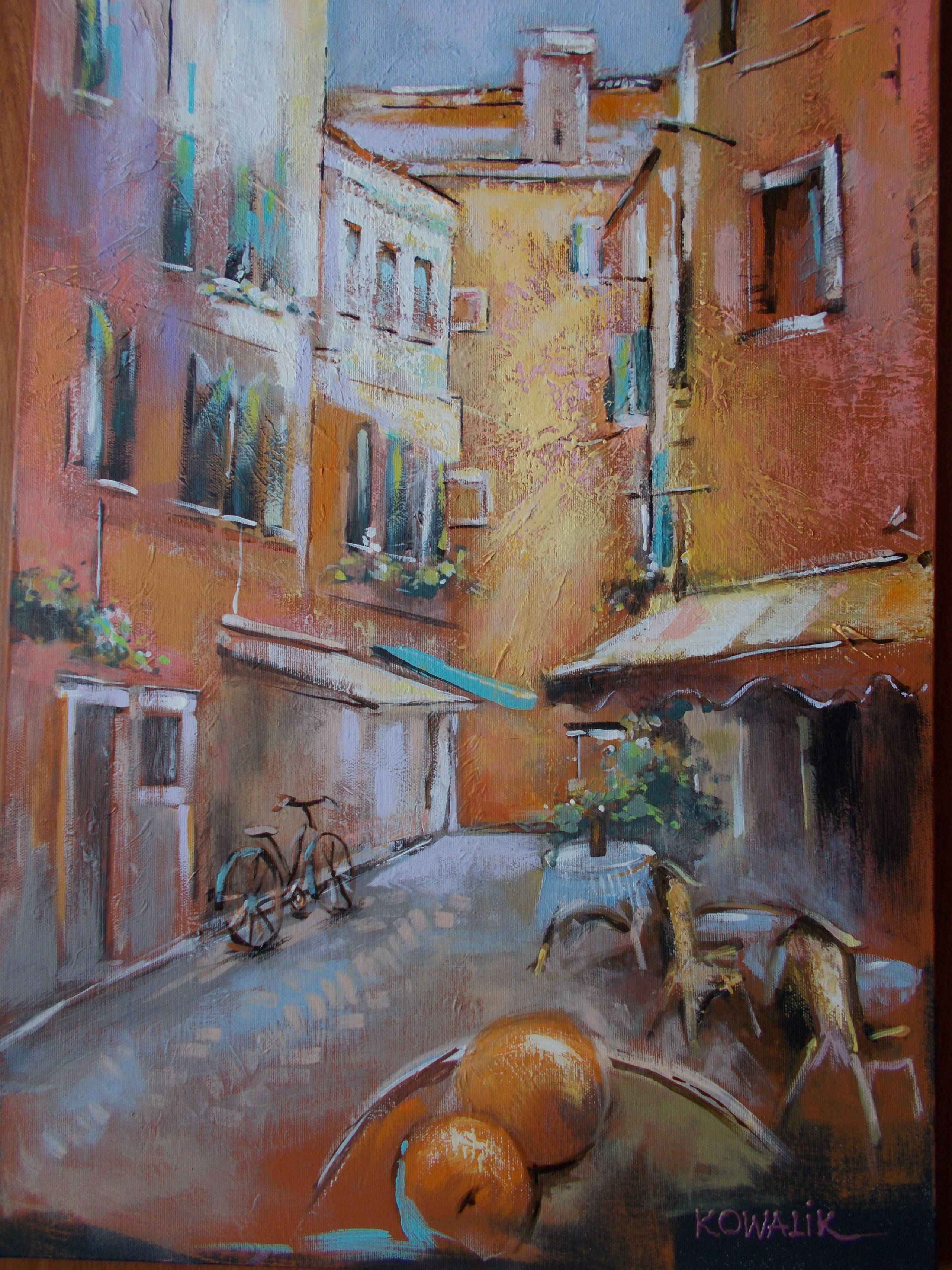 Obraz zachwyca żywymi barwami, które tętnią ciepłem i energią. Pomarańczowe i złote odcienie budynków wpadają w głęboką symbiozę z błękitem nieba i subtelną zielenią okiennic. Wow, jakie to piękne! Na pierwszym planie widoczny jest koszyk z apetycznie wyglądającymi owocami, które zdają się aż kusić swą soczystością. Na bocznej uliczce, leżacy rower dodaje scenie uroku małego miasteczka, które emanuje spokojem i nostalgicznym charakterem. Atmosfera jest magiczna, taka... jakby czas zatrzymał się gdzieś między jednym a drugim oddechem. Widać ślady pędzla, które podkreślają ekspresję i dynamikę. Artysta użył techniki impastu, co nadaje teksturę i głębokość. Miejsce to swoim urokiem budzi w widzu pragnienie odkrycia zakątka, schowanego przed miejskim zgiełkiem. Czyż to nie jest "amazing"? Przeplatanie się swobodnych form i subtelnych przejść kolorów wywołuje miłe poczucie tęsknoty za południowym słońcem.