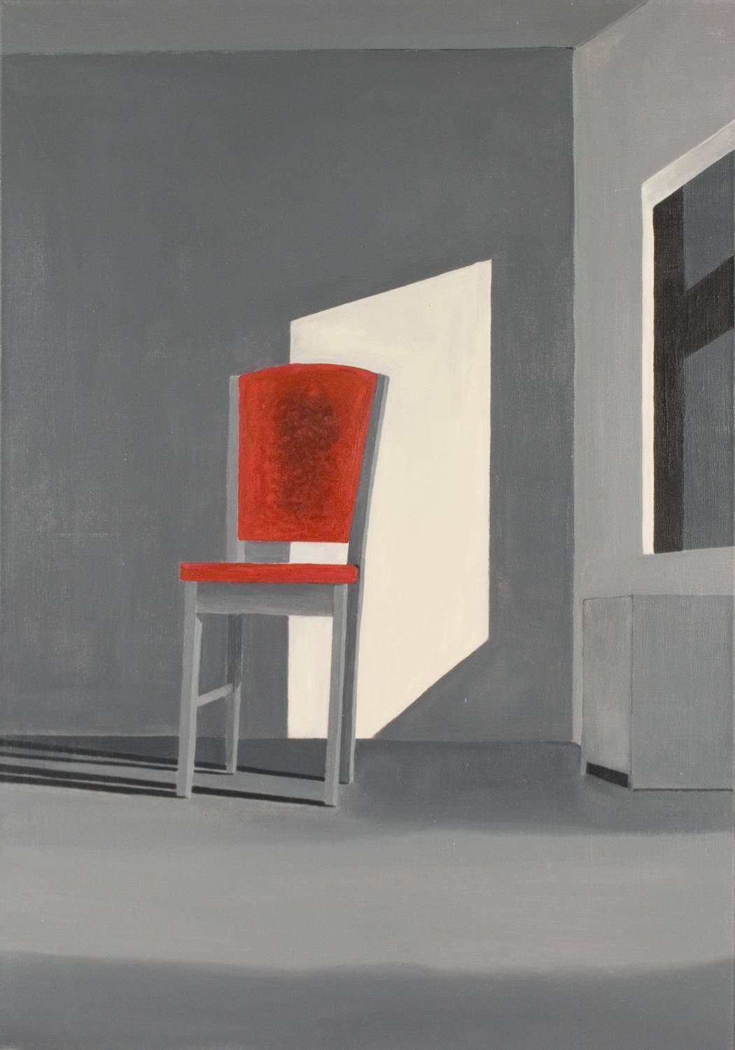 Na obrazie widzimy minimalistyczną, lecz zarazem intrygującą scenę. Dominują odcienie szarości, które tworzą tło dla czerwonego krzesła stojącego na środku pokoju. Prostokątne, geometryczne kształty nadają całemu dziełu surowości i chłodu, ale owo krzesło wprowadza ciepło i ożywienie. Światło wpadające przez okno tworzy kontrastowy cień, który nadaje przestrzeni głębi. Nastrój obrazu jest introspektywny, niemal melancholijny, jakby sugerował chwilę zatrzymania, refleksji. Czujesz się jak w "twilight zone", pomiędzy rzeczywistością a snem. Artysta zastosował technikę dużych, płaskich plam barwnych, co nadaje obrazowi abstrakcyjny charakter. Można odnieść wrażenie, że krzesło czeka na kogoś, kto przyjdzie, usiądzie i opowie swoją historię. Dla dziecka to po prostu pokój, gdzie tata siada i ogląda bajki. Widz może odczuwać ciszę, która zdaje się niemal namacalna. Mnie osobiście urzeka subtelna gra świateł i cieni, sprawiająca, że obraz jest pełen nieopowiedzianych jeszcze story.