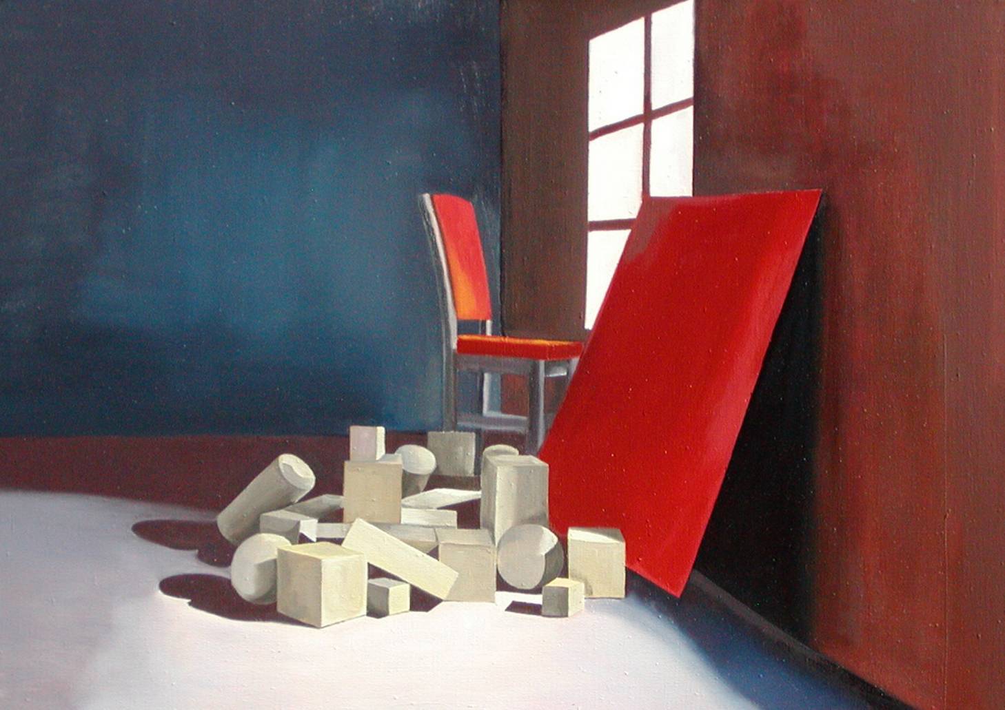 Na obrazie dominują kontrasty kolorów i form. Głębokie, ciemnoniebieskie tło z prawej strony delikatnie wtapia się w jasne światło po lewej. Na przodzie, na tle przygaszonej czerwieni prostokąta, leżą różne geometryczne bryły: sześciany, walce. Czerwone krzesło stoi dyskretnie w kącie. Światło wpadające przez okno sprawia, że cień geometrycznych kształtów tworzy tajemniczy wzór na podłodze. Atmosfera obrazu jest pełna spokoju, z nutką tajemnicy. Look, how this play of light and shadows creates coś niezwykle fascynującego. Styl impresjonistyczny z lekką dawką surrealizmu dodaje dziełu dynamiki i głębi. Patrząc na obraz, można poczuć pewną melancholię, ale też i zachwyt nad prostotą form. Może to być zarówno wspomnienie z dzieciństwa, gdy bawiłem się takimi klockami, jak i refleksja na temat przemijalności. Och, jakie to ciekawe! Kiedy patrzę na ten obraz, przypomina mi się, jak bardzo sztuka może wpływać na nasze emocje i myśli.