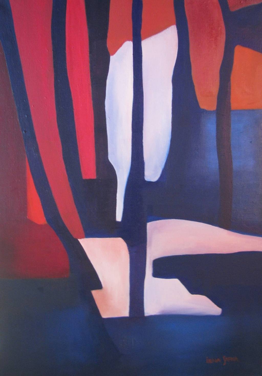 Obraz emanuje intensywnością, która jest trudna do zignorowania. Dominują tu ciepłe, nasycone barwy - ognista czerwień przeplata się z granatowymi akcentami, tworząc dynamiczny kontrast. Kształty są abstrakcyjne, przypominają nieco zniekształcone litery lub figury geometryczne, które plączą się i splatają ze sobą. Cała kompozycja wydaje się być w nieustannym ruchu, jakby wiatr poruszał rozpostartym płótnem. Atmosfera obrazu jest nieco tajemnicza, niemal melancholijna, ale jednocześnie pełna energii. Wydaje się, że artysta wykorzystał tu technikę impasto, nakładając farbę grubymi warstwami, co dodaje tekstury i głębi. Masywne pociągnięcia pędzlem nadają całości styl raw, przywodząc na myśl odważne i zdecydowane gesty. Gdy patrzę na ten obraz, czuję się jakbym był na środku wirującego kalejdoskopu, a każdy patrzący może wyczytać z niego coś innego. Może być to metafora dla chaosu współczesnego świata lub wyraz skrajnych emocji. Mój pies by tu nie znalazł kości, ale dzieciak mógłby powiedzieć: "to wygląda jak pofalowane lizaki!" Styl tego obrazu jest unikalny, intrygujący, wręcz calling out to the viewer, by wejść do środka. Osobiście, obraz budzi we mnie uczucie niespokojnej ciekawości, jakbym chciał rozpłynąć się w jego barwach. Fascynująca jest też możliwość interpretacji tych form. Co to wszystko znaczy? Artysta zostawia nam swobodę, nie daje jednoznacznych odpowiedzi.