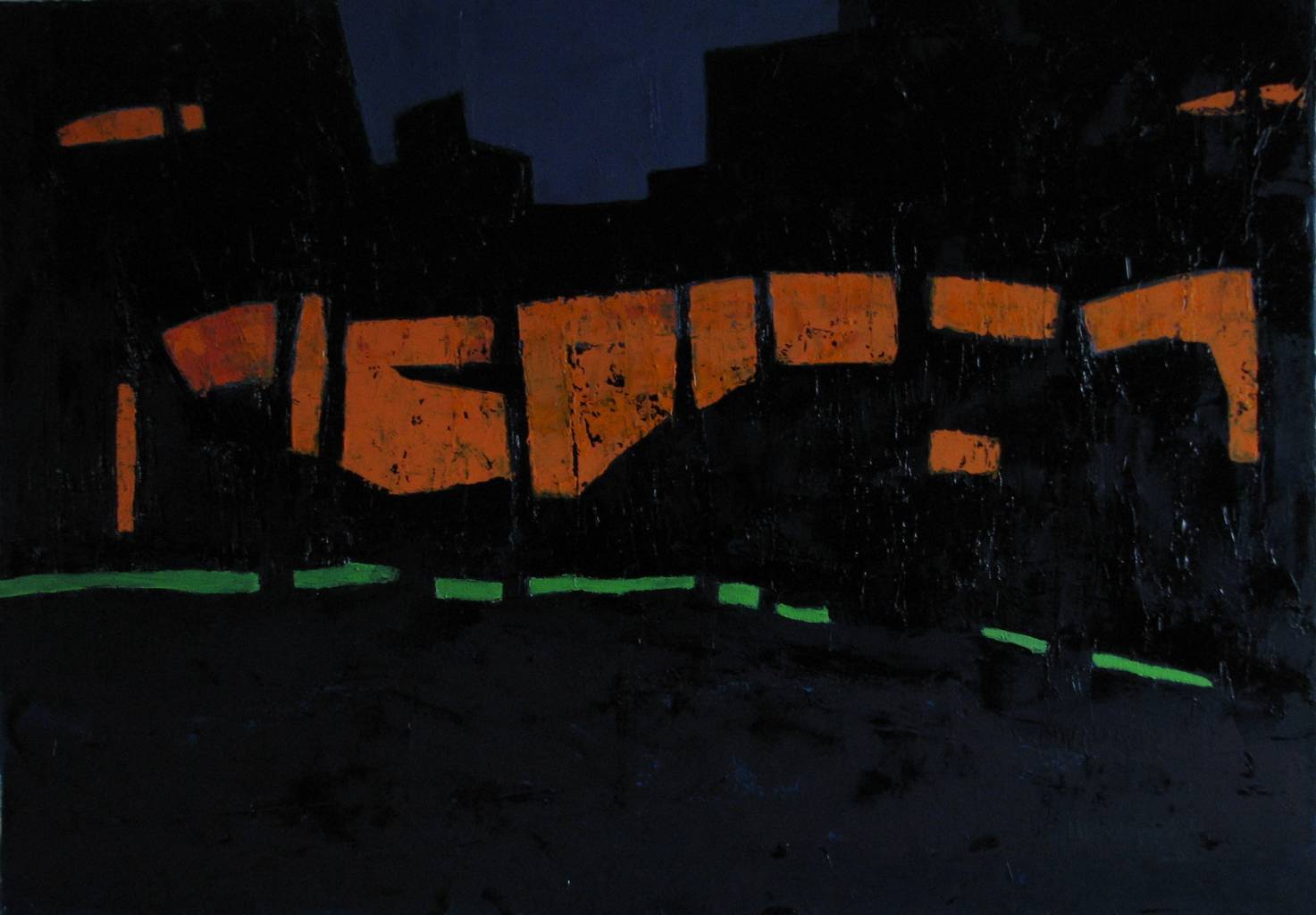 Na obrazie dominuje ciemność, przerywana wyrazistymi pomarańczowymi i zielonymi akcentami. Kontury przypominają abstrakcyjne kształty, które mogą sugerować miejską scenerię. Kolory są intensywne, kontrastujące ze sobą i wzajemnie się uzupełniające. Mroczny granat w tle dodaje głębi, tworząc tajemniczą atmosferę. Całość emanuje spokojem, trochę jak cisza przed burzą. Techniki artystyczne, które można tu dostrzec, to wyraźne pociągnięcia pędzla i teksturowane powierzchnie, nadające dziełu surowości. Dziecko by powiedziało: „To wygląda jak miasto w nocy”. Styl artystyczny obrazu można określić jako abstrakcyjny ekspresjonizm, co pozwala na różnorodne interpretacje. Obraz może wywoływać uczucie nostalgii lub odosobnienia, zależnie od spojrzenia odbiorcy. Dla mnie osobiście, przypomina długie wieczory spędzane na spacerach po mieście. To „mood” obrazu jest intrygujący, skłaniający do refleksji. Może przypominać o ukrytych tajemnicach, pozostawiając miejsce na wyobraźnię.