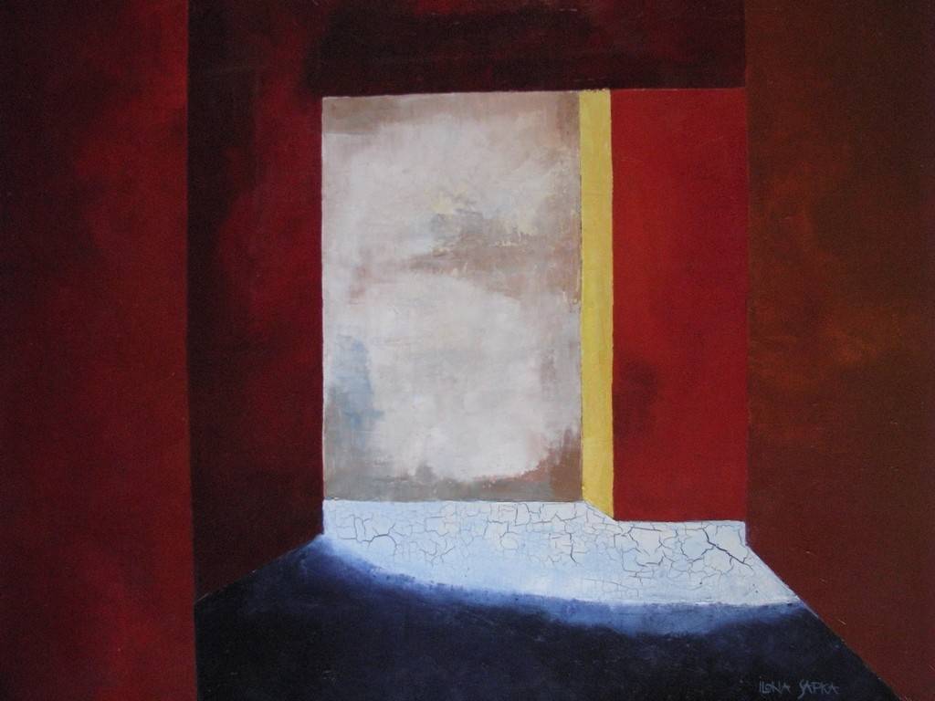 Na obrazie dominują intensywne, ciepłe kolory. Głębokie odcienie czerwieni otaczają prostokątną formę przypominającą okno. W jego wnętrzu jaśnieją blade szarości i subtelne przebarwienia błękitu, co przywodzi na myśl niebo o świcie. Obok okna, wyrazista żółta linia dodaje dramatyzmu, kontraścąc z miękkim tłem. Podłoga jest ciemna, z bielą przypominającą pęknięcia na starym chodniku. Kompozycja jest oszczędna, lecz niezwykle wyrazista. Atmosfera obrazu jest tajemnicza, nieco oniryczna, budzi uczucie zadumy. Artysta użył technik, które zacierają granice między rzeczywistością a snem, bawiąc się światłem i ciemnością. Wykorzystanie kontrastu kolorów i grubo ciosanych krawędzi podkreśla monumentalność sceny. Można poczuć echo ciszy, echo przestrzeni, które rezonuje z wnętrzem odbiorcy. Patrząc na to dzieło, można przypomnieć sobie chwile, gdy patrzymy przez okno myśląc o dalekiej podróży lub kolejnym dniu. Obraz ten może wywoływać tęsknotę za tym, co jest poza zasięgiem, longing za nieznanym. Jest w nim pewna nostalgia, trochę jak w "Alice in Wonderland", gdzie każda przestrzeń kryje nowe emocje. Dla dziecka to "duże okno do wielkiego pokoju". Cała ta scena, choć statyczna, pulsuje życiem i zaprasza do refleksji nad tym, co jest po drugiej stronie.