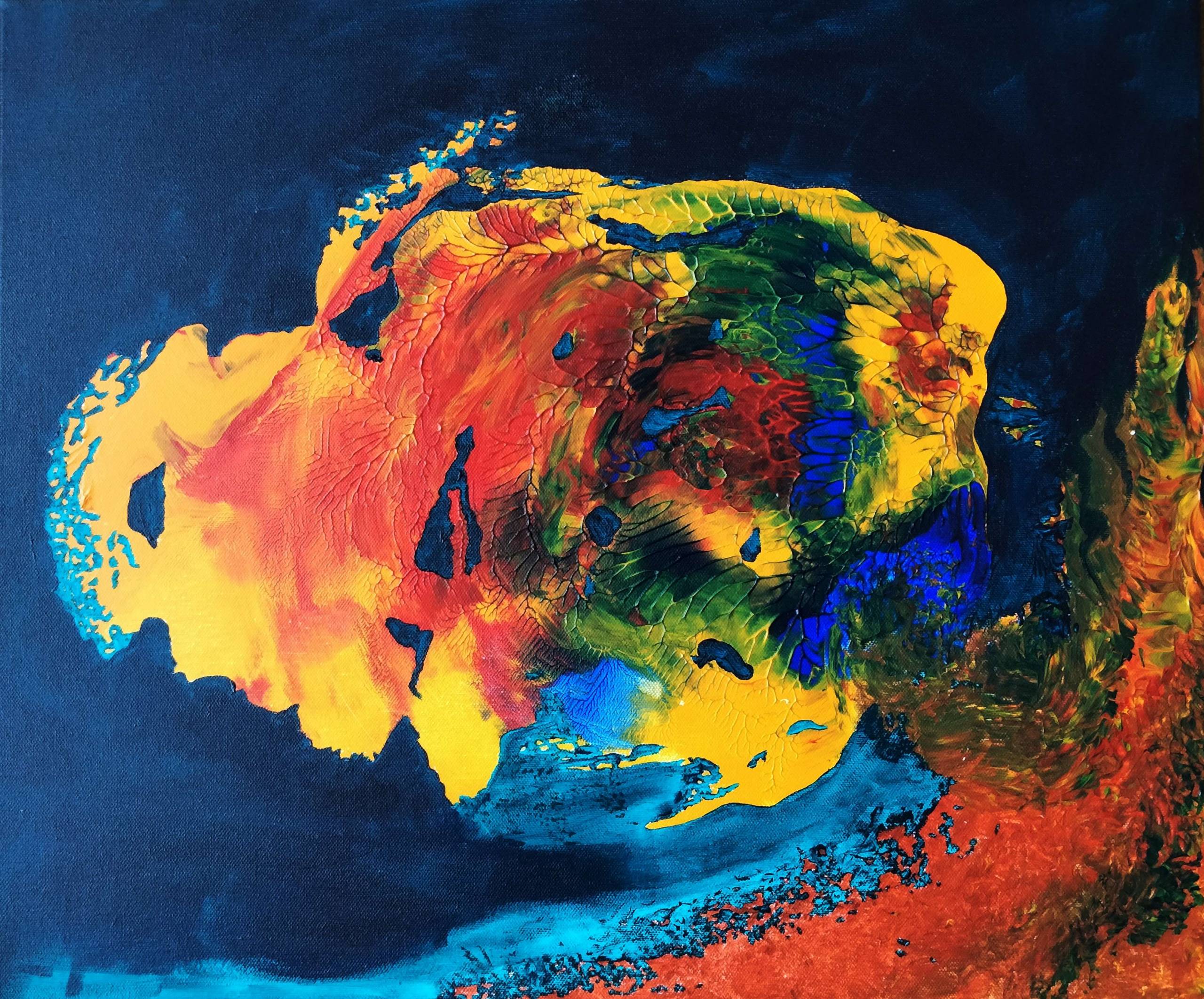 Obraz emanuje eksplozją żywych barw. Intensywne żółcie i czerwienie przenikają się z głębokim granatem, tworząc dynamiczną kompozycję. Centralna część obrazu zdaje się być w ruchu, jakby była wirującą planetą lub roztopionym szkłem. Na pierwszy rzut oka chaos, ale po chwili dostrzega się porządek. Artysta zastosował technikę pouringu, która nadaje dziełu organiczny charakter. Tak, jakby farba sama decydowała, gdzie płynąć. Atmosfera obrazu jest intensywna, niemalże elektryzująca. Wyczuwalny jest tutaj pewien niepokój, ale też fascynacja. To jak odkrycie tajemniczego świata, który dopiero się poznaje. Każdy kolor to inna emocja, inne odczucie. Wow, jaki on jest kolorowy i fajny! Patrząc na te kolory, można poczuć ciepło, jakby słońce dotykało twarzy. It's mesmerizing. Ten obraz może przywołać wspomnienia z dzieciństwa, kiedy wszystko zdawało się być możliwe, a kolory były bardziej jaskrawe. Dzieło wzbudza refleksję nad chaosem i porządkiem. Idealne dla tych, którzy cenią sobie siłę koloru i spontaniczność formy. Ten obraz to prawdziwy artystyczny rollercoaster.
