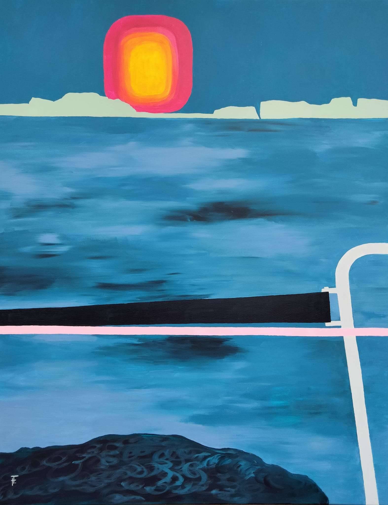 Obraz jest jak z innego świata. Na pierwszym planie rozpościera się blask słońca, które przypomina wielką kulę ognia. Ma intensywnie żółty środek, otoczony różem, który stopniowo przechodzi w czerwony pierścień. Tło to spokojna tafla wody, której odcienie błękitu są jakby delikatne pociągnięcia pędzla. W zetknięciu z słońcem całość sprawia wrażenie zachodzącego nieba. Jest tu też coś intrygującego – jak gdyby poręcz basenu przepoławiająca krajobraz. I jest jeszcze taki różowy pasek, action, który dodaje nowoczesności, a może i odrobinę chaosu. Atmosfera obrazu jest pełna spokoju. Czujemy jakby zorza polarna spotkała się z zachodem słońca. Można się w nim niemal zatopić. Artysta wykorzystał płynne linie i kontrastujące kolory, aby stworzyć surrealistyczny pejzaż. Technika przypomina nieco impresjonizm, ale jest jednocześnie bardzo nowoczesna. Emocje, które może wywołać, to spokój i zagubienie. A może nawet nostalgia za nieznanym miejscem. Jak patrzę na ten obraz, czuję coś, co trudno opisać słowami. Jakby to był portal do innego wymiaru. Choć się nie rusza, czuję ruch – tę płyciznę wody i gorące powietrze od słońca. Kiedy dorosnę, to tak właśnie namaluję moje przygody – tak by napisało dziecko zachwycone kolorami. Intrygujące jest, jak artysta połączył elementy abstrakcji z wyrazistymi formami. To prawdziwy feast for the eyes.